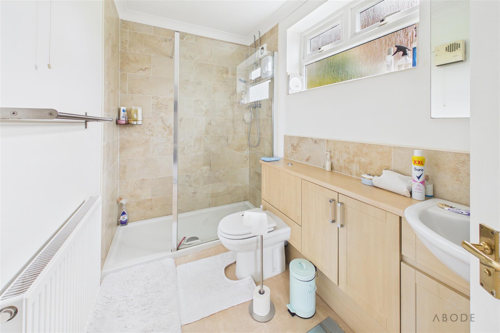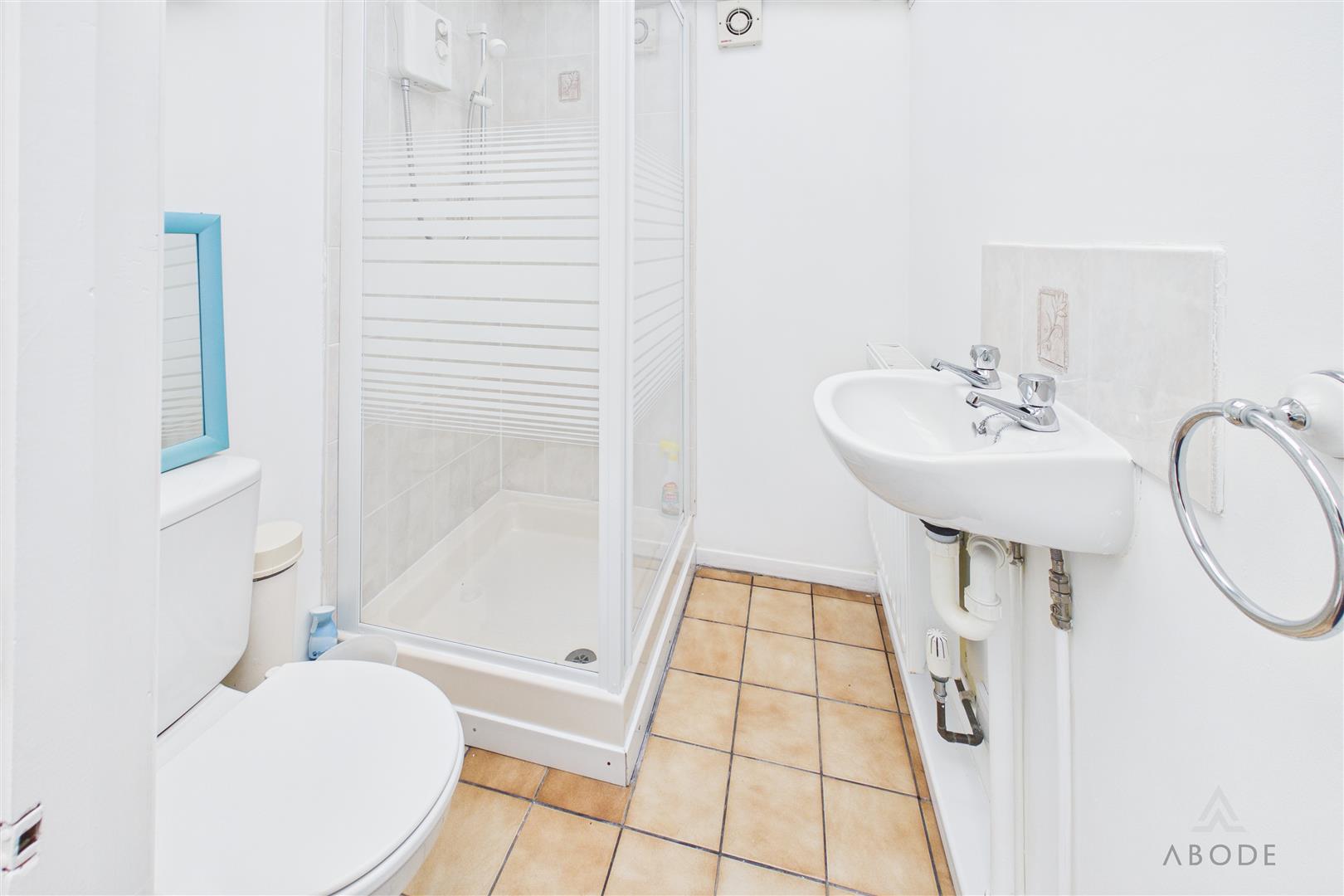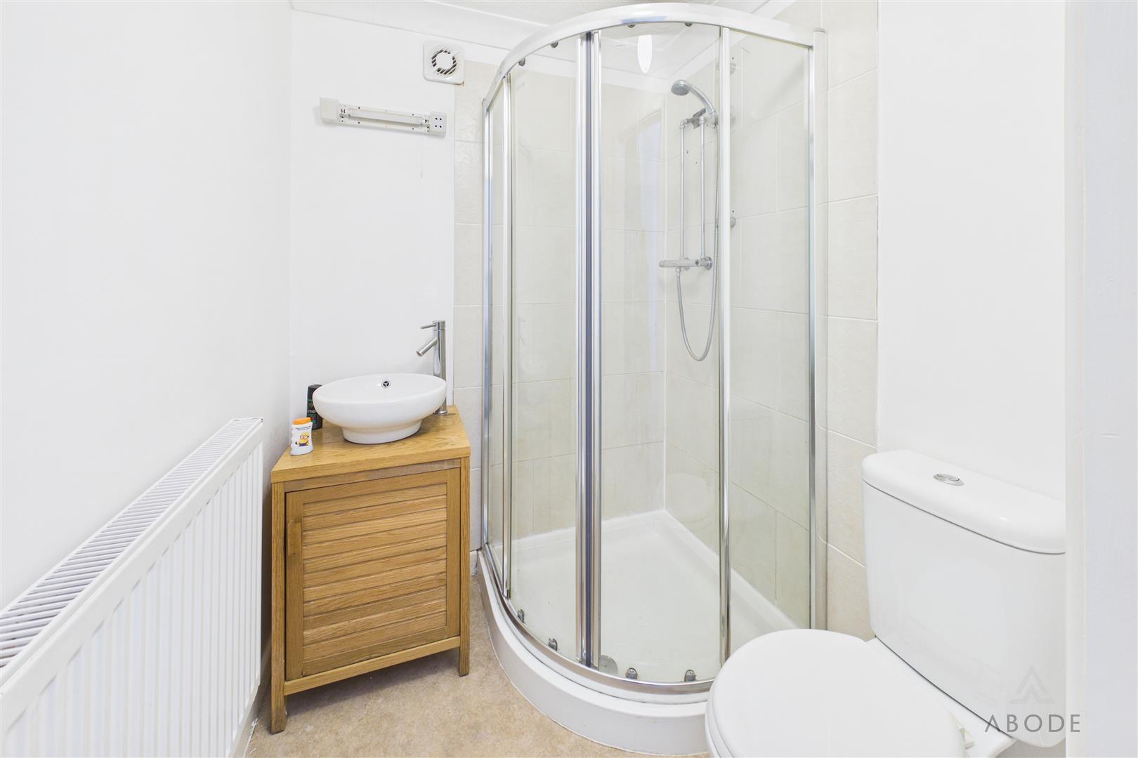 Enclosed shower, wash hand basin, low flush wc, radiator.