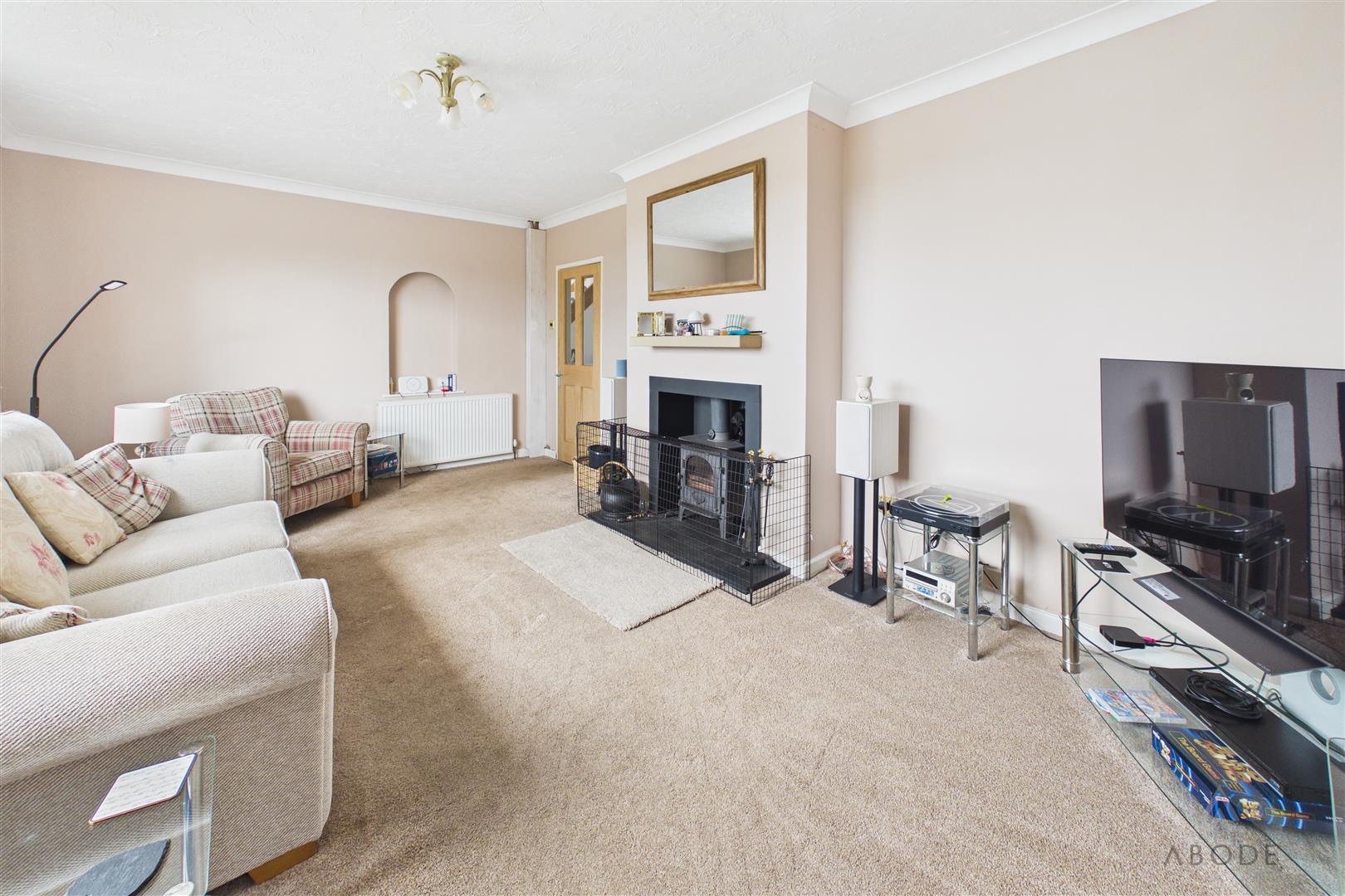Feature log burner with hearth, upvc double glazed window and a radiator.
