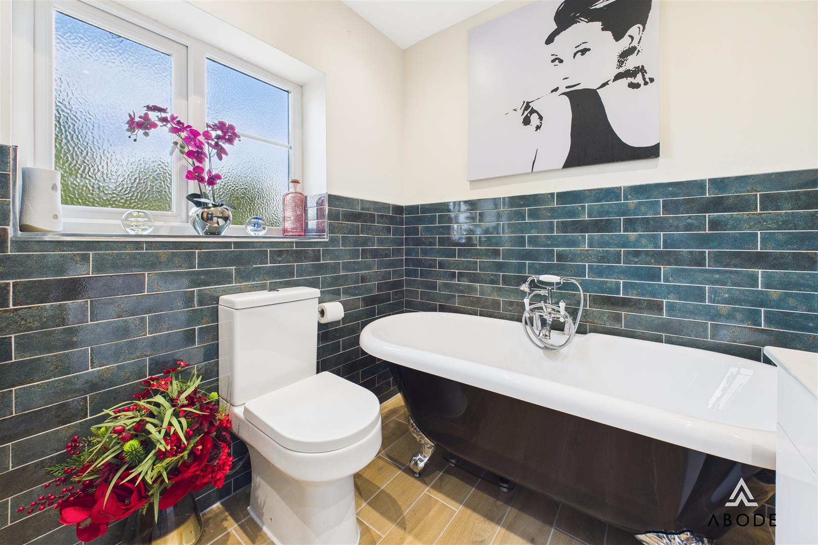 The re-fitted bathroom offers a stylish four-piece suite comprising a low-level WC with continental flush, freestanding claw-foot bath with chrome taps and shower attachment, large corner shower cubicle with waterfall showerhead and complementary wall tiling, and wash hand basin with chrome mixer tap. Additional features include a central heating radiator, ceiling spotlights, and a uPVC double-glazed frosted window to the rear elevation.