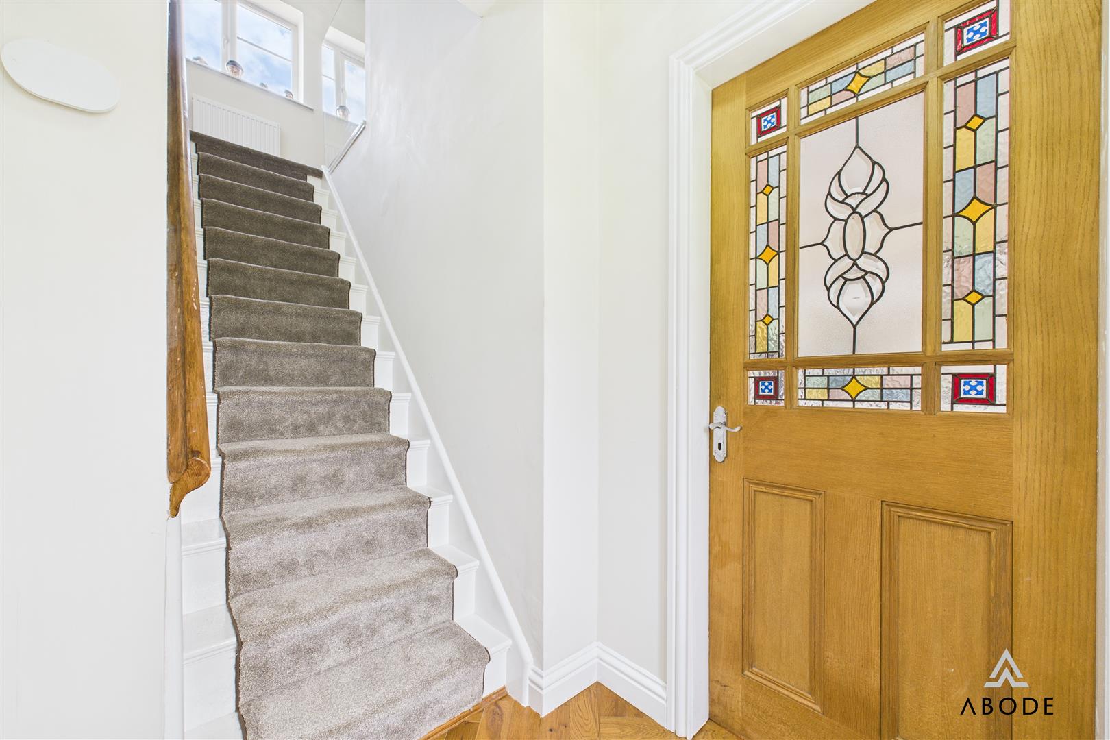 A composite double-glazed front entry door opens into a bright and welcoming hall with herringbone oak flooring throughout. The staircase rises to the first-floor landing, and internal doors lead to the principal ground-floor rooms.