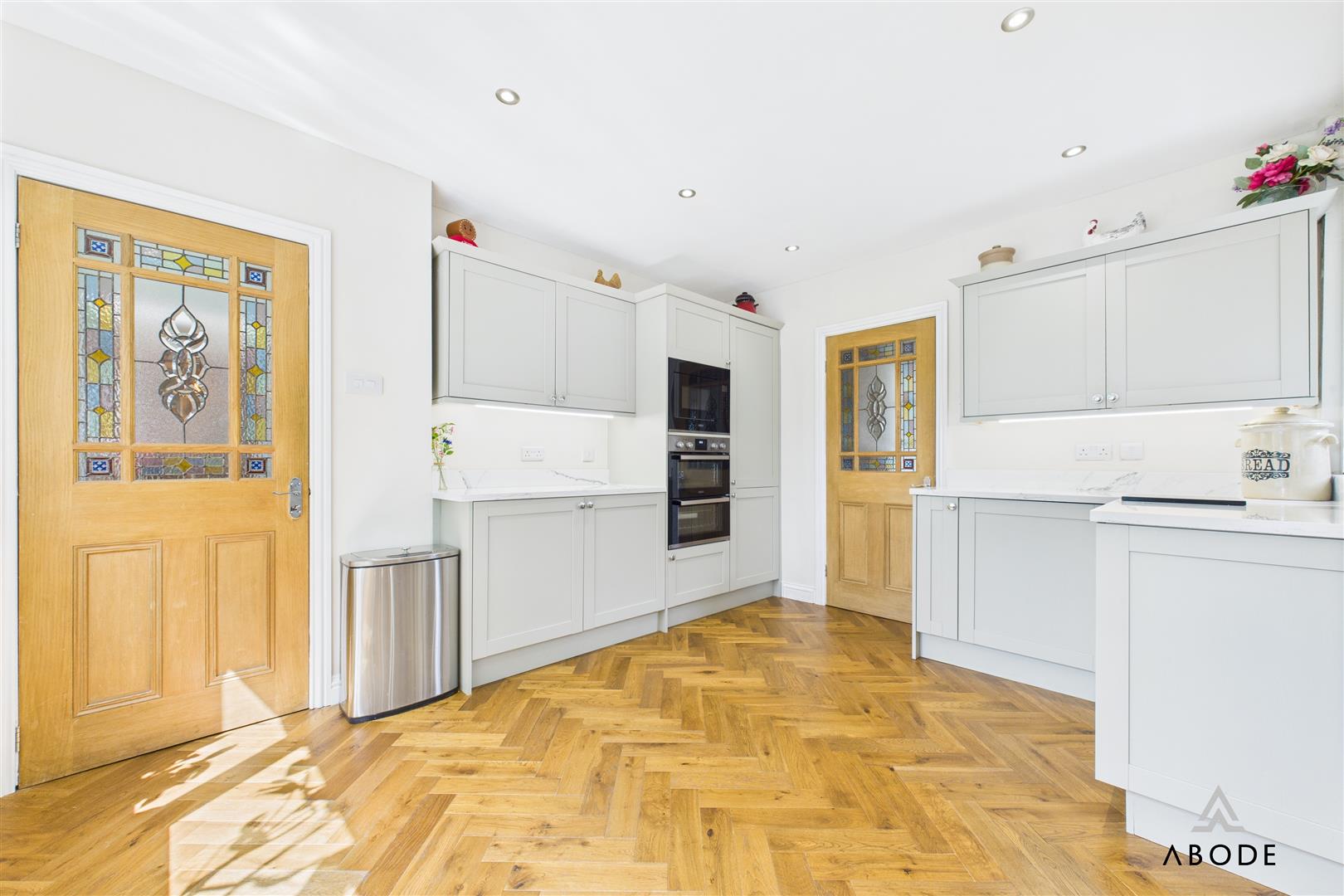 The heart of the home is a bespoke Howdens kitchen finished with a range of matching base and eye-level storage cupboards and drawers, all topped with elegant granite worktops. Integrated appliances include double ovens, a microwave, fridge freezer, induction hob with integrated extractor, ceramic sink unit with inset drainer and mixer tap, and dishwasher. Three uPVC double-glazed windows to the front and side elevations allow natural light to flood the space, while French doors open to the rear garden from the living/dining space. The herringbone oak flooring continues throughout, with ceiling spotlights and three central heating radiators completing the stylish and functional design.