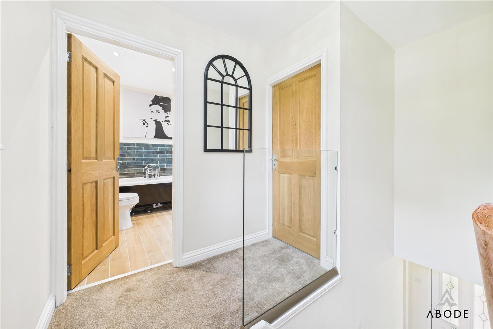 The first-floor landing is brightened by a uPVC double-glazed rear window and features a central heating radiator, glass barrier with handrail to the staircase, loft hatch access, and doors leading to the bedrooms and bathroom.