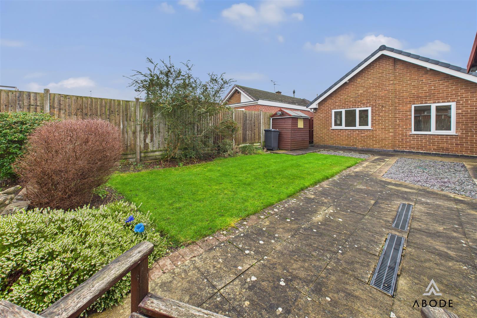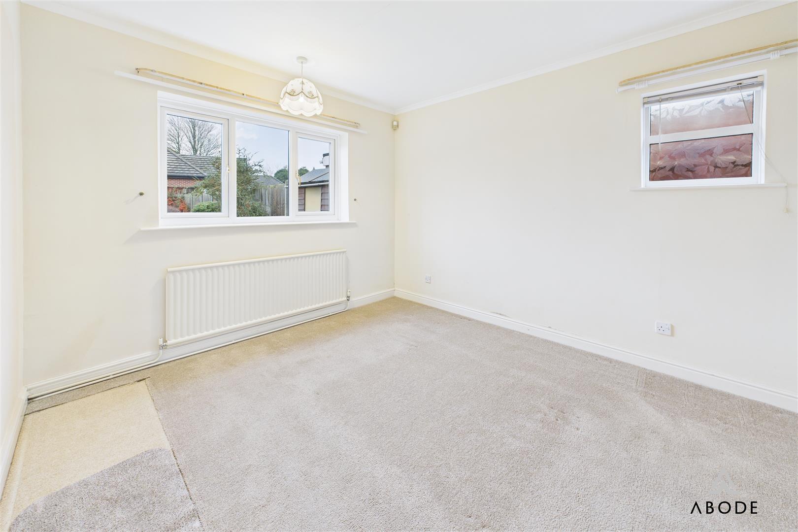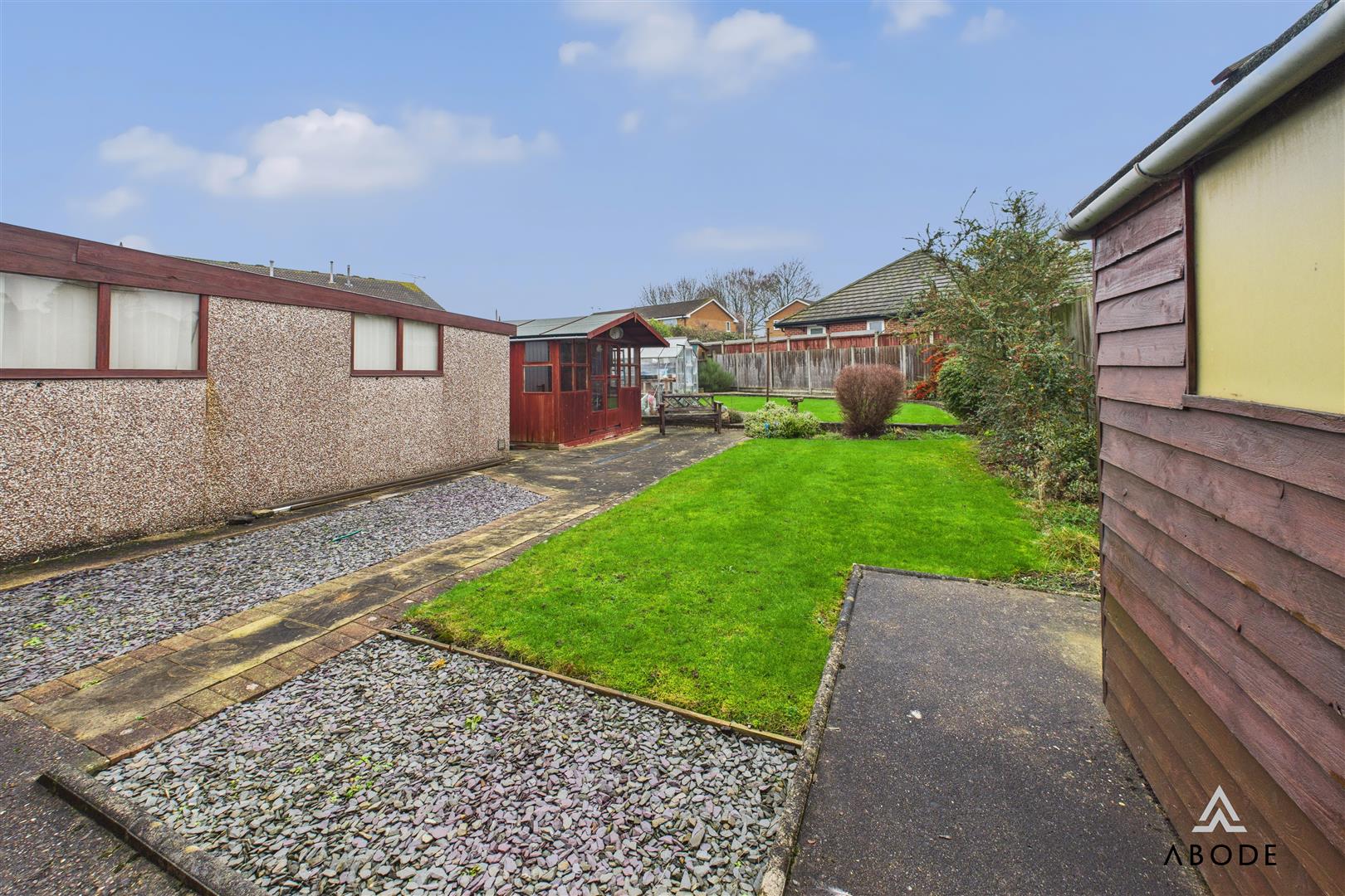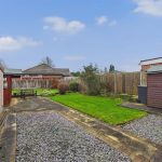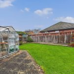 Front lawn and a side drive down to a single garage. Good size rear garden with lawns, borders with shrubs and plants, paved seating area summer house and a greenhouse.