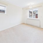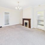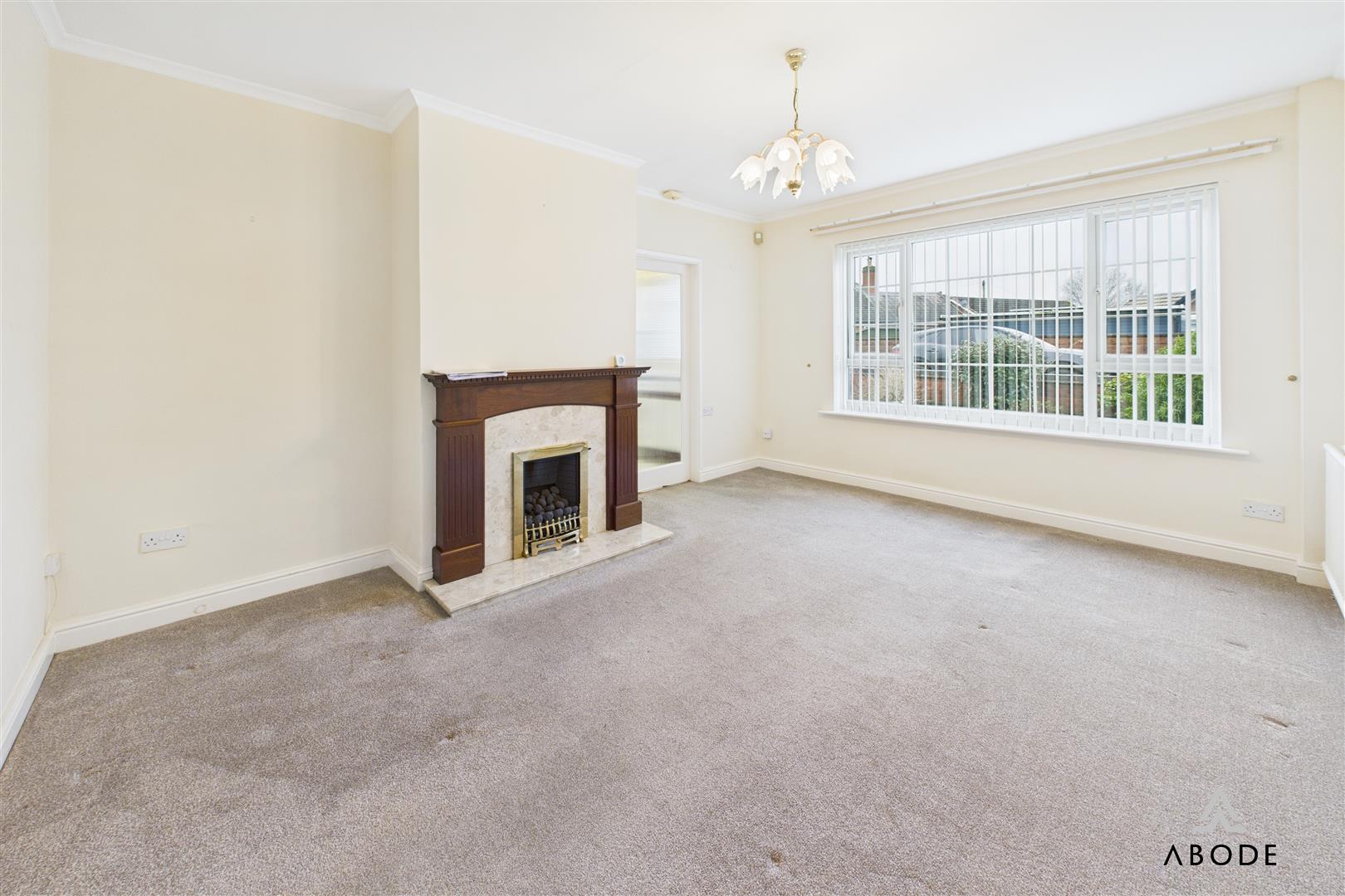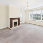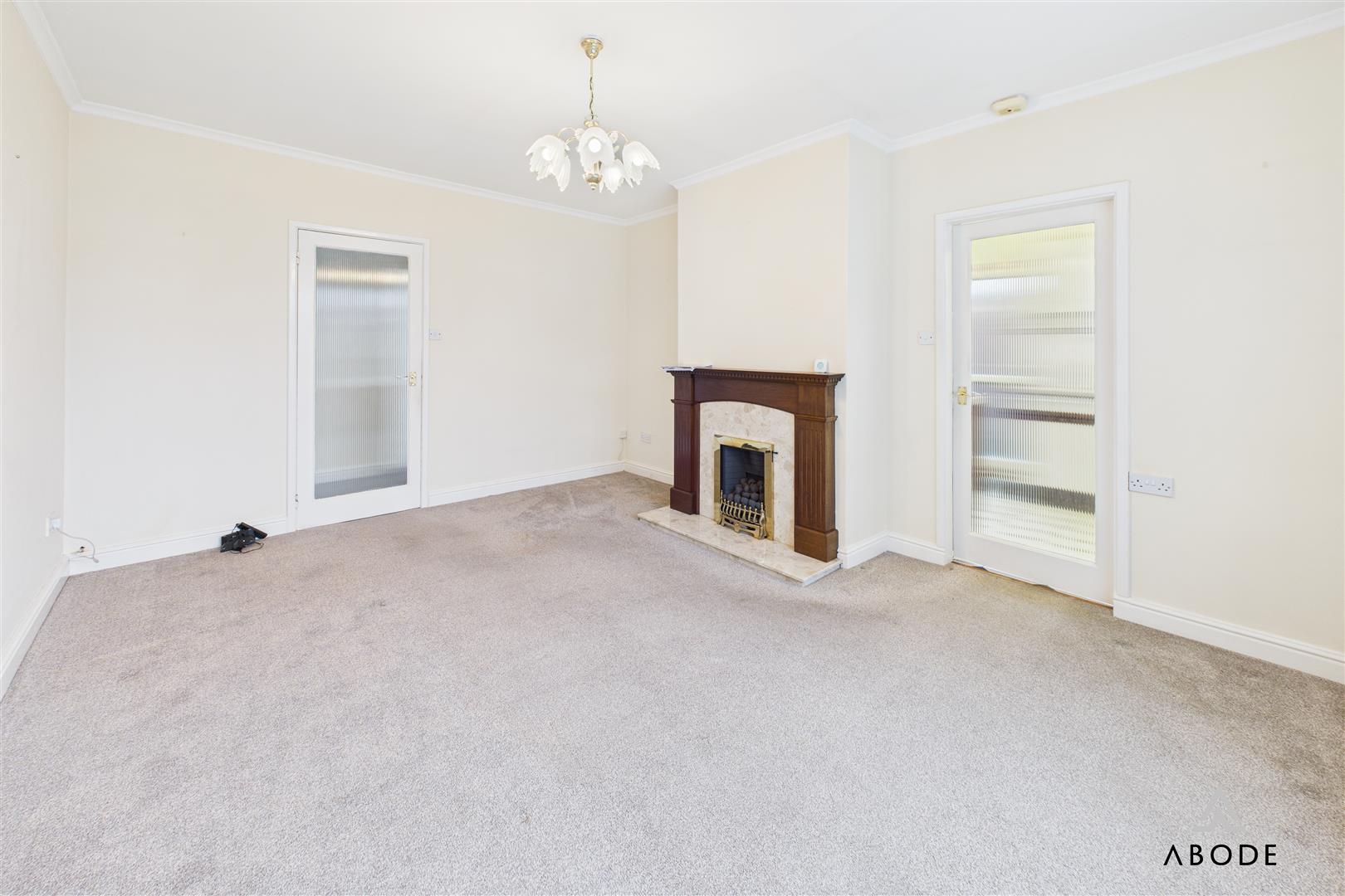 Feature fireplace with living flame co effect gas fire marble insert and hearth and a wood surround, radiator, and UPVC double glaze window to the front elevation.