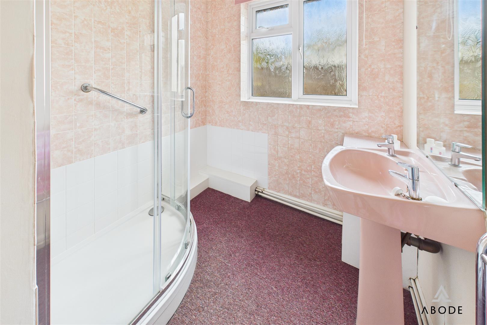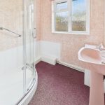 Wash hand basin, corner shower cubicle, upvc double glazed window and a heated towel radiator.