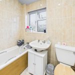 Panelling close bath with a shower and shower screen, low flush WC, wash handbasin, radiator and UPVC double glazed window.