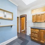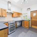 A well-designed kitchen with a UPVC double-glazed window to the rear and complementary tiled flooring. It offers a range of matching base and eye-level cupboards, roll-top work surfaces and tiled surrounds. Features include a stable oak rear entry door, central heating radiator and integrated appliances such as a stainless steel sink and drainer with mixer tap, cooker, hob and extractor hood. A double-glazed ceiling skylight provides further natural light, and there is plumbing for additional under-counter appliances. An internal door leads to two further areas including the bathroom.