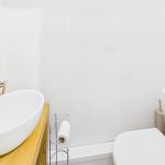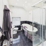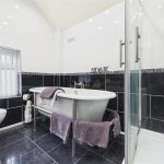 The bathroom is a standout feature—generously sized and fitted with a modern suite including a freestanding bath, wash basin and WC, along with a separate shower enclosure.