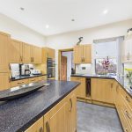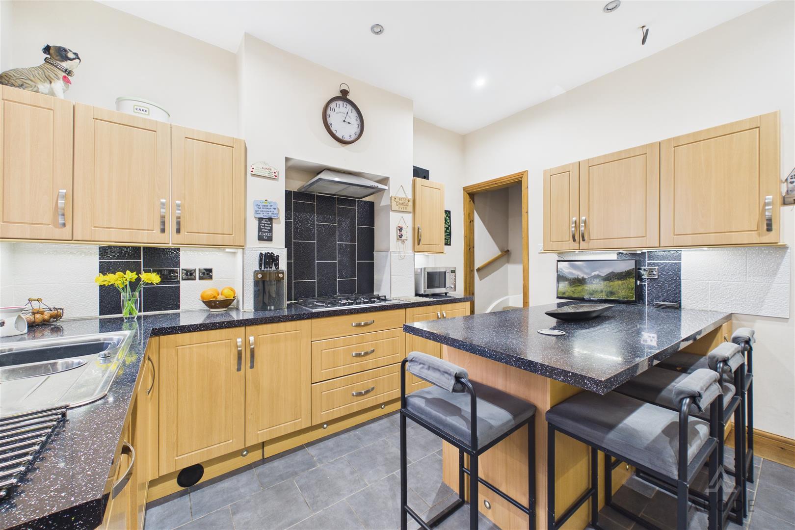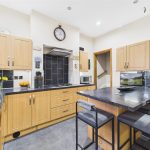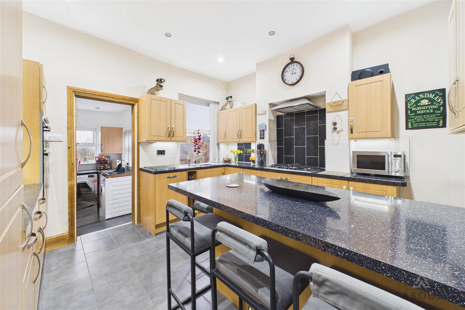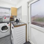 To the rear is a fitted kitchen, arranged with a range of wall and base units and generous worktop space, with a useful breakfast bar for everyday dining. From the kitchen, doors lead through to a separate utility room—ideal for white goods and additional storage—along with access to the rear garden. Completing the ground floor is a convenient WC.