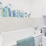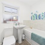 With UPVC double-glazed frosted window to the side with built-in blinds. Comprising a three-piece suite including low-level WC with continental flush, pedestal wash hand basin with mixer tap and tiled splashback, and a bath with mixer tap and complementary tiling. Additional features include a heated towel radiator and extractor fan.