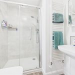 With UPVC double-glazed frosted window to the front with built-in blinds. Comprising a low-level WC with continental flush, pedestal wash hand basin with mixer tap and tiled splashback, and a double shower cubicle with sliding glass screen and complementary wall tiling. Additional features include a heated towel radiator and extractor fan.