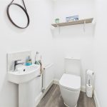 Fitted with a low-level WC with continental flush, pedestal wash hand basin with mixer tap and tiled splashback. Additional features include a central heating radiator, coat hooks and an extractor fan.