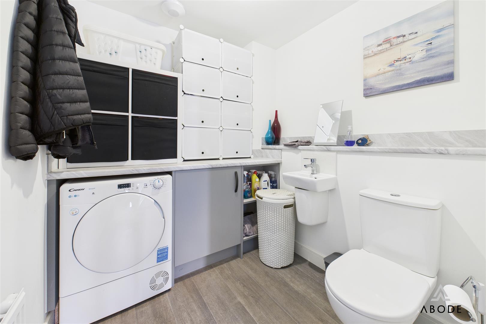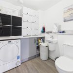 With a low-level WC with button flush, floating wash hand basin with mixer tap and tiled splashback, base storage with roll-top preparation work surfaces, and space for freestanding under-counter white goods, central heating radiator, and extractor fan.