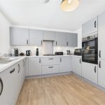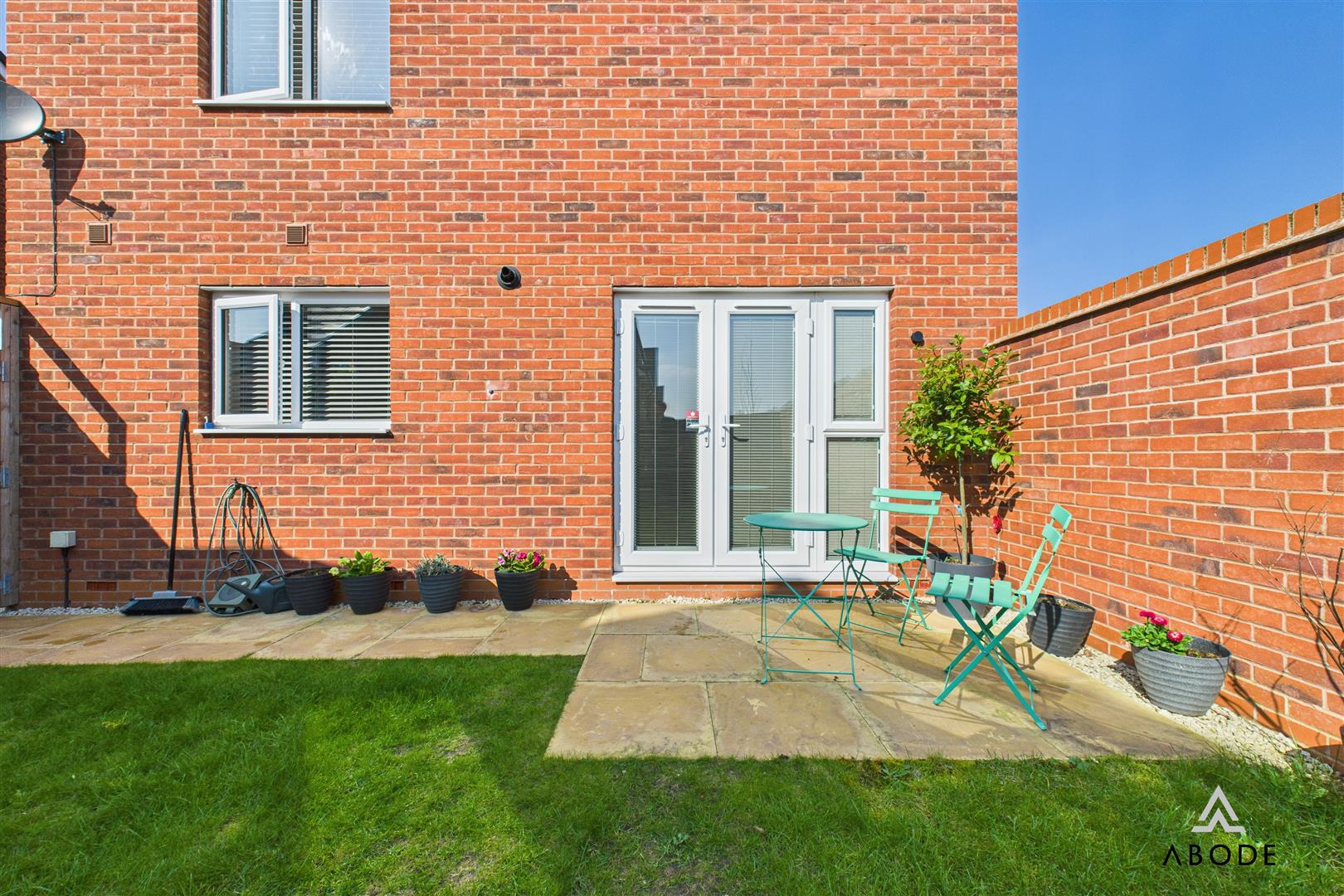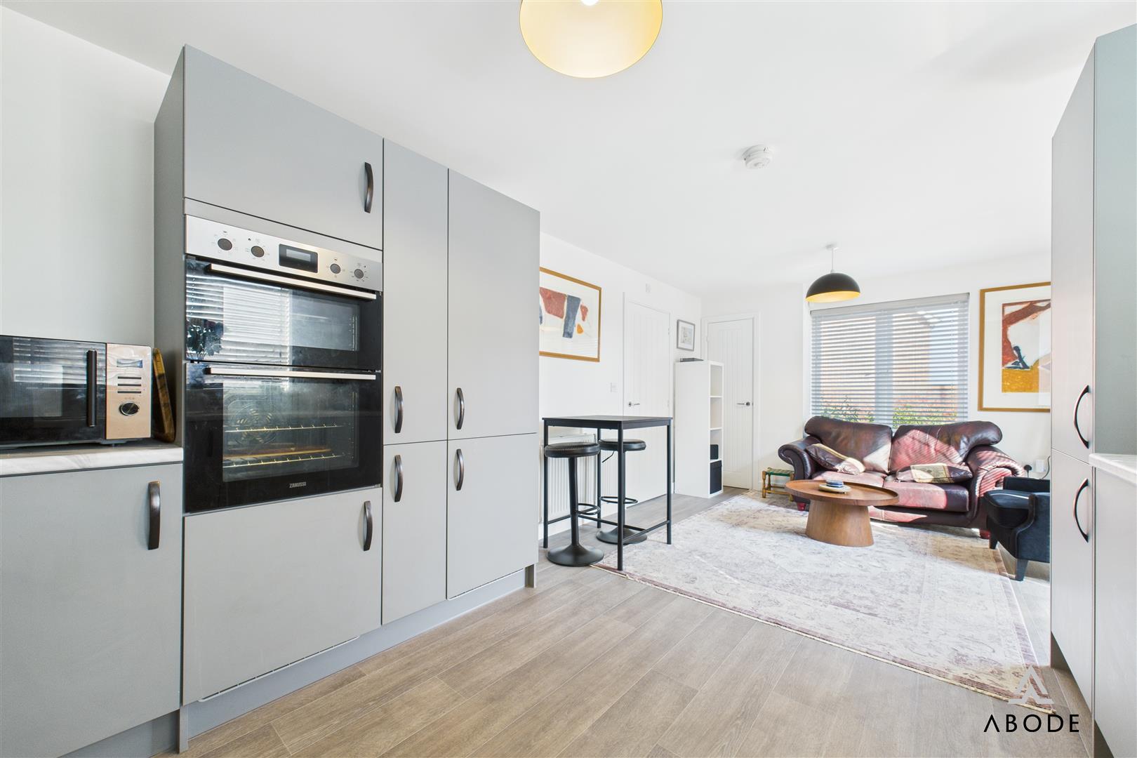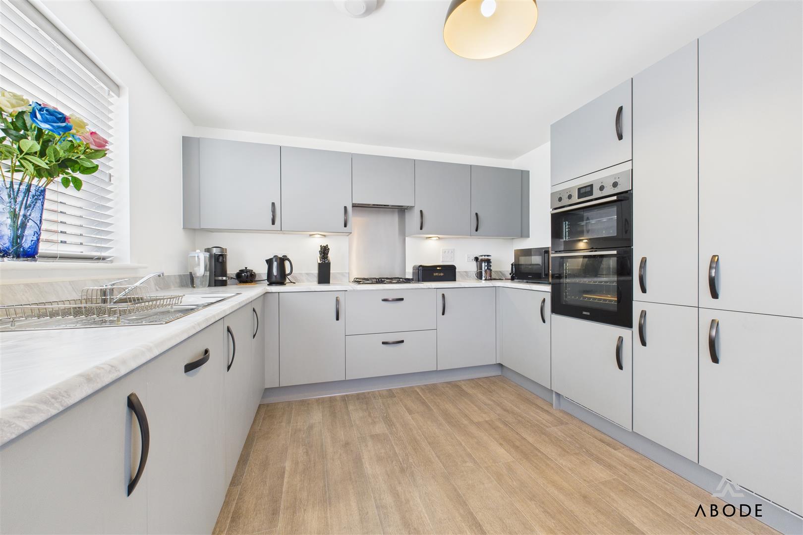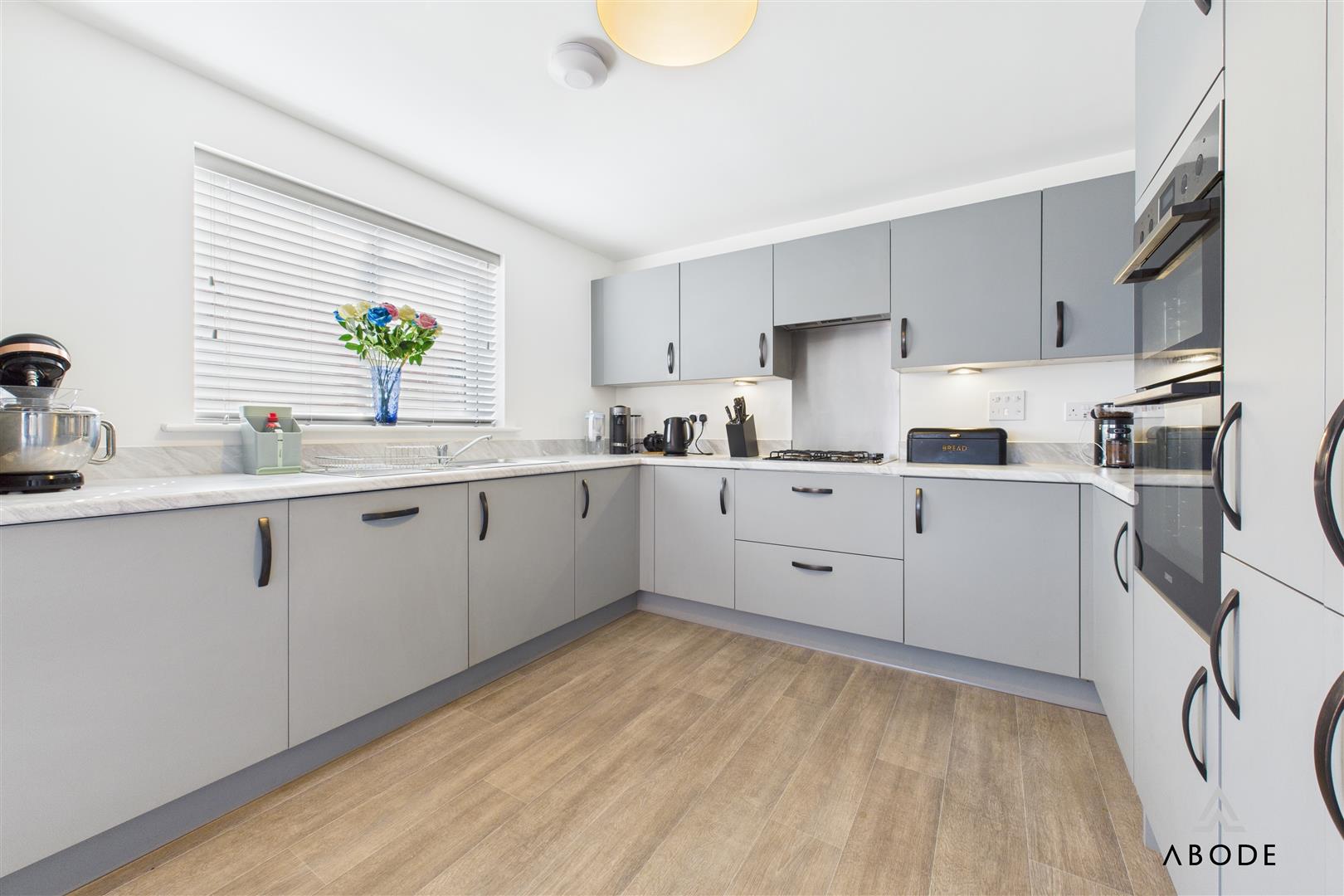 Featuring dual aspect views to both front and side elevations with 2x UPVC double-glazed units and a set of UPVC double-glazed French doors leading to the rear garden with built-in shutter blinds. The kitchen features a range of matching base and eye-level storage cupboards and drawers with roll-top preparation work surfaces and a range of integrated appliances including a one and a half stainless steel sink and drainer with mixer tap, four-ring stainless steel gas hob with built-in extractor, oven, grill, fridge, freezer, and dishwasher. In housing is the central heating combination gas boiler. Additionally, the kitchen has a central heating radiator and a useful utility cupboard housing the electrical consumer unit and fibre collection.