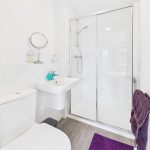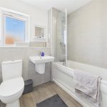 With a UPVC double-glazed frosted glass window to the front elevation, featuring a three-piece bathroom suite comprising a low-level WC with button flush, floating wash hand basin with mixer tap, bath unit with folding glass screen, shower over, and complementary tiling to wall coverings, shaving point, central heating radiator, and built-in extractor fan.