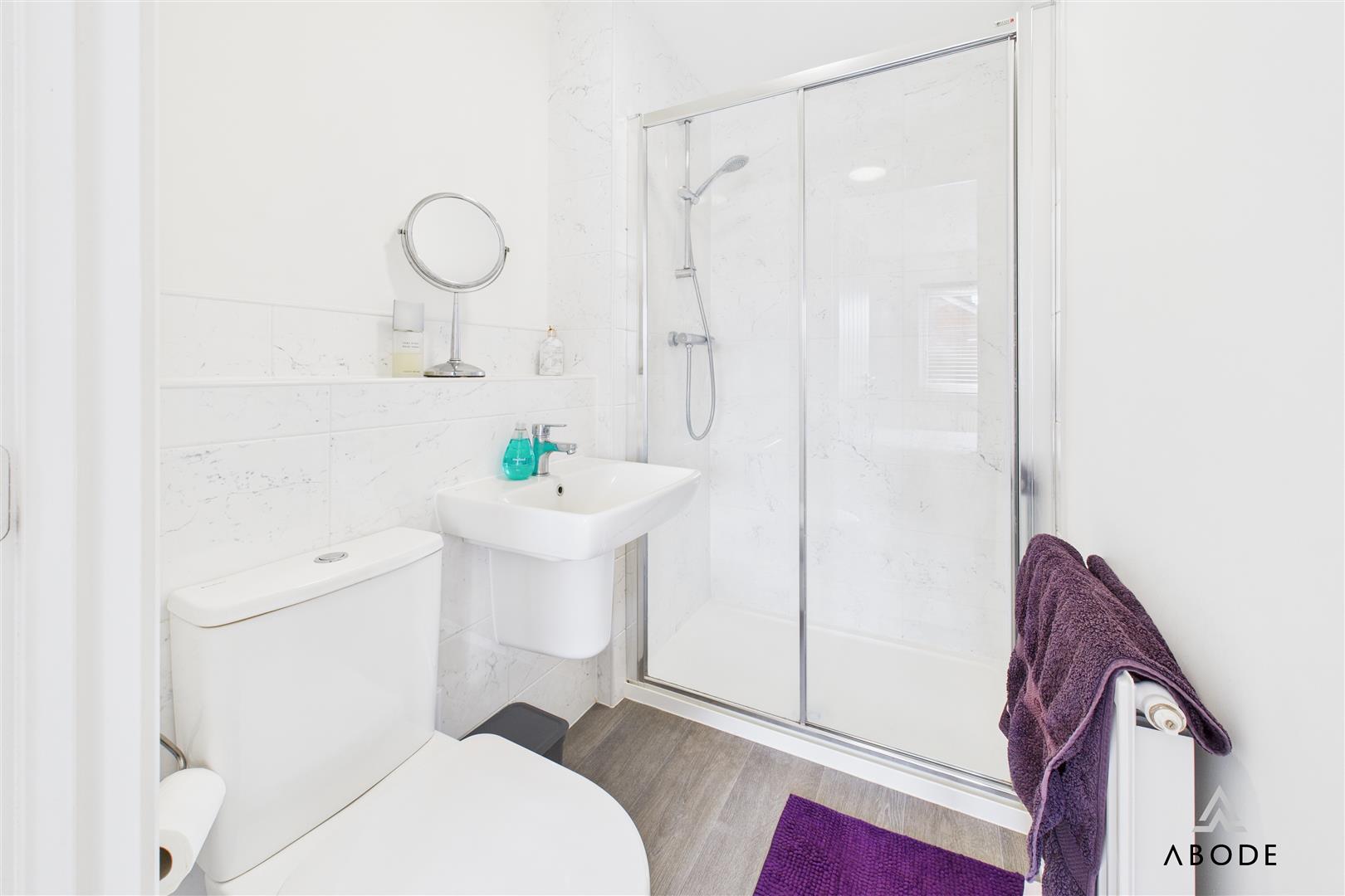 Featuring a three-piece shower room suite comprising a low-level WC with button flush, floating wash hand basin with mixer tap, shower with sliding glass screen, and complementary tiling to wall coverings, extractor fan, and central heating radiator.