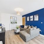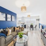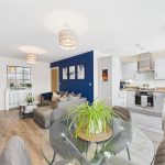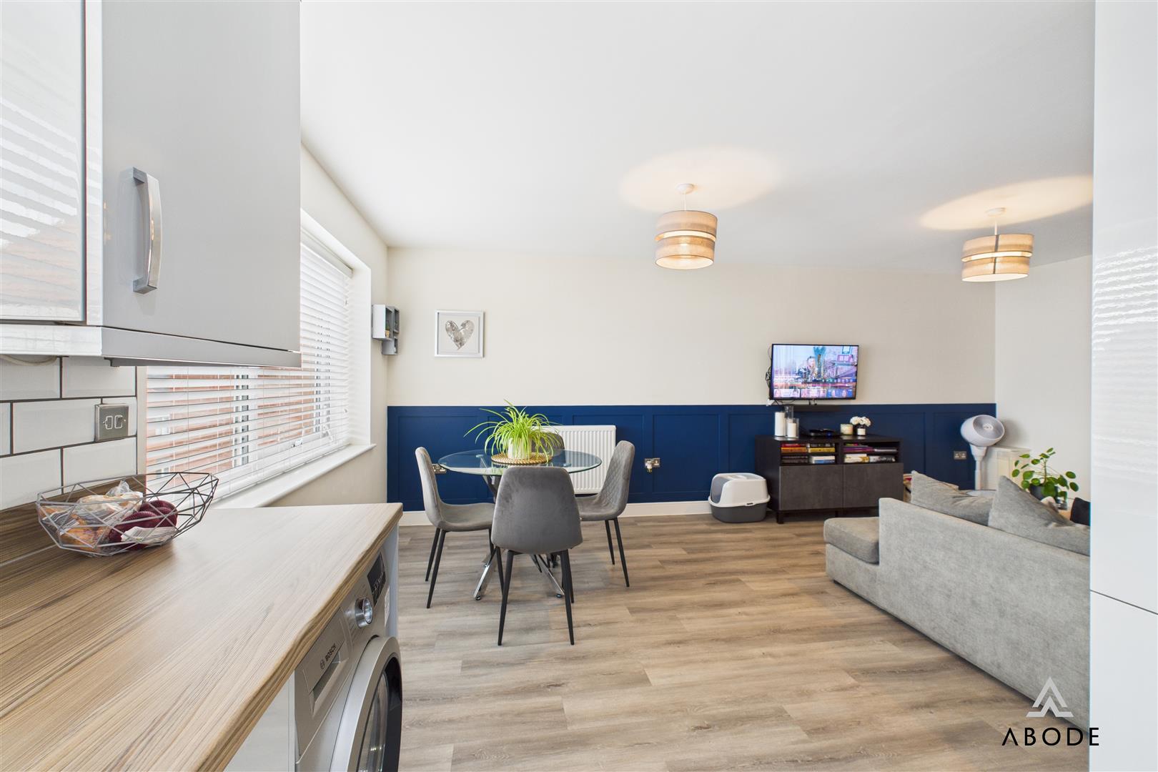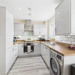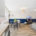 The open-plan living space forms the heart of the home, with a generous living and dining area complemented by stylish décor and contemporary flooring. Large windows bring in excellent natural light, enhancing the feeling of openness. The adjoining modern kitchen is finished to a high specification, fitted with a range of gloss units, wood-effect worktops, tiled splash backs, and integrated appliances including oven, hob with extractor, fridge freezer, and space for a washing machine.