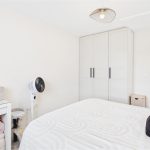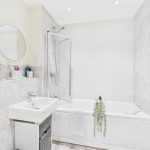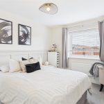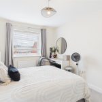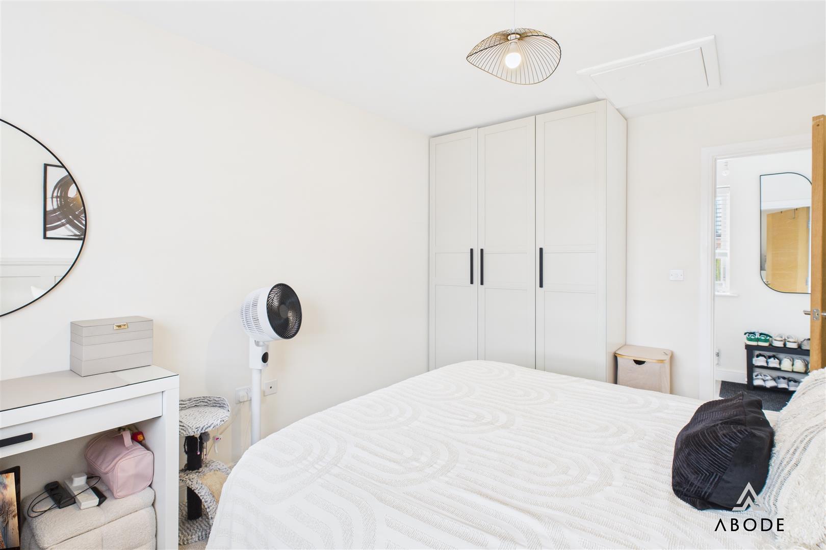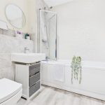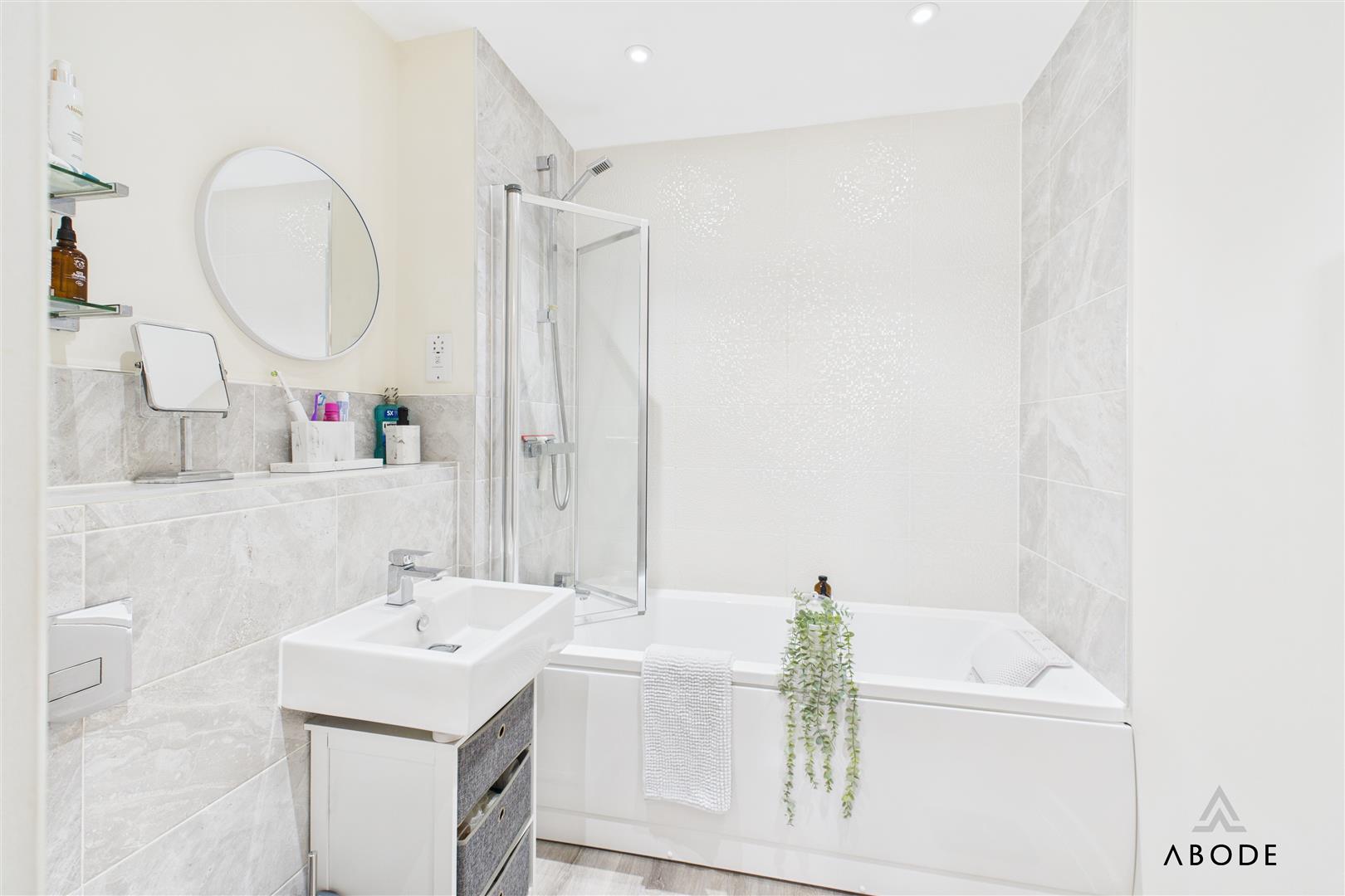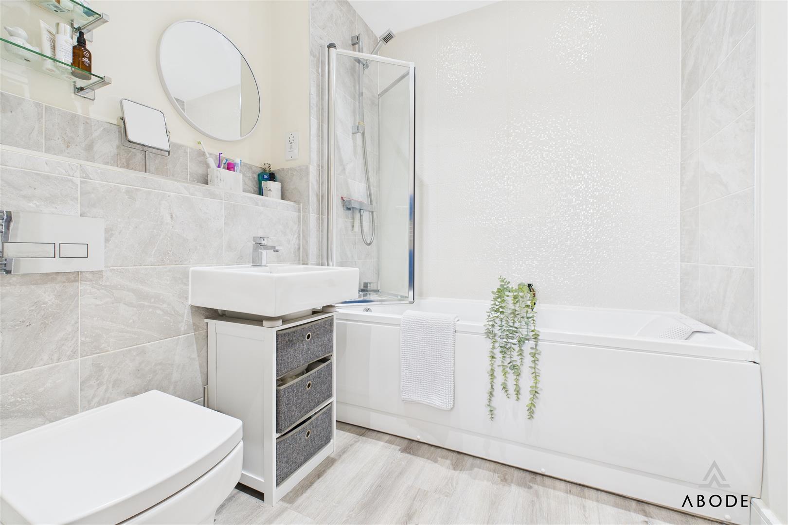 The bedroom is a well-proportioned double, tastefully presented with a neutral décor. The bathroom offers a sleek three-piece suite comprising a bath with overhead shower and glass screen, wash hand basin with storage below, and low-level WC, all finished with modern tiling and a heated towel rail.