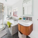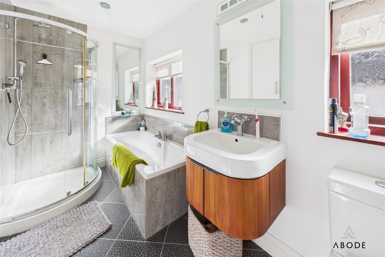 Corner shower cubicle, bath, vanity sink unit with wash hand basin and storage cupboard under, low flush WC, chrome ladder style radiator and two double glazed windows.
