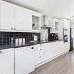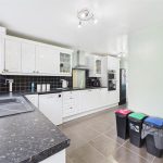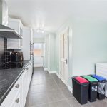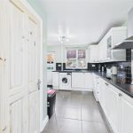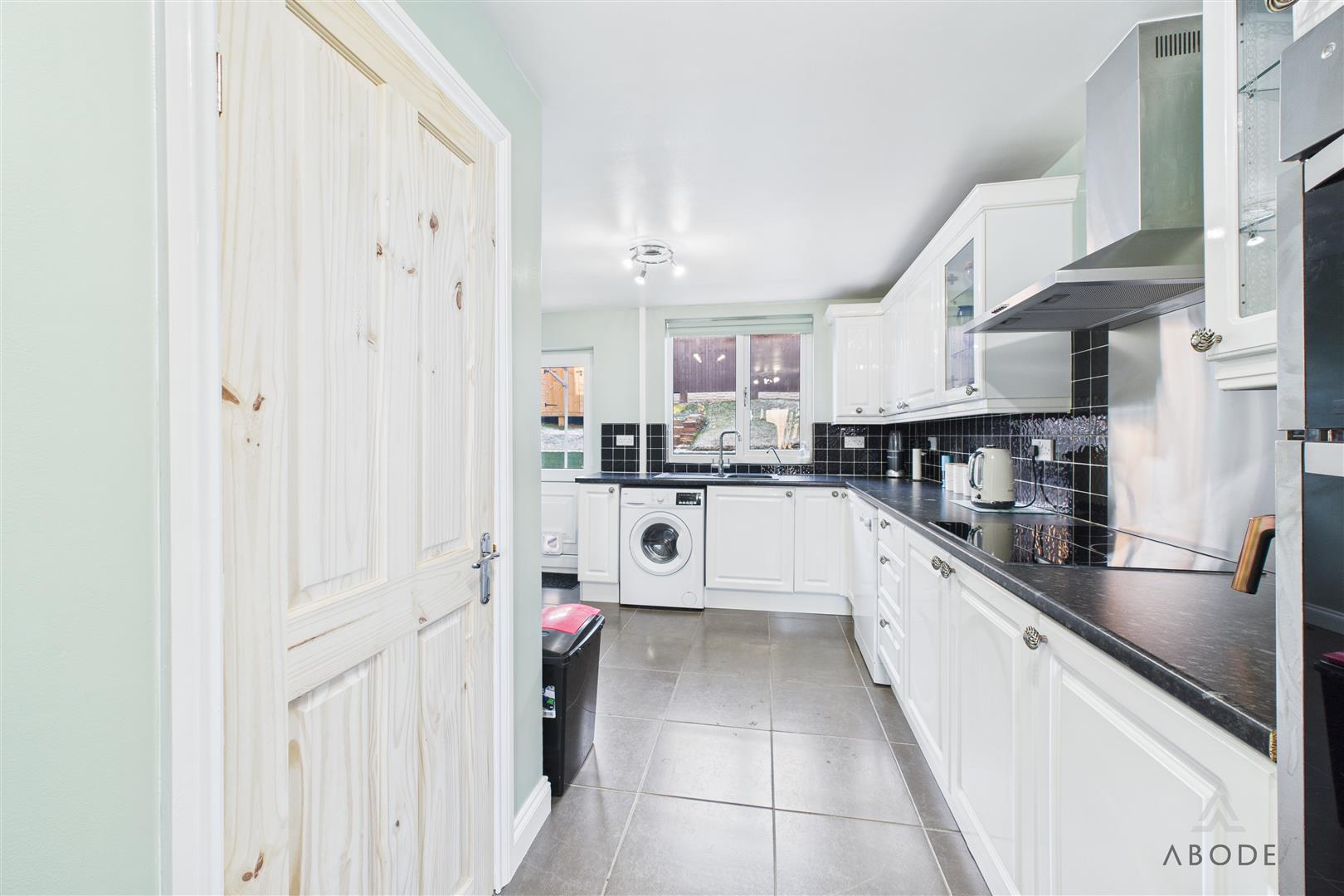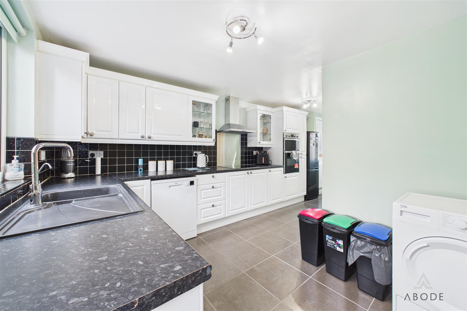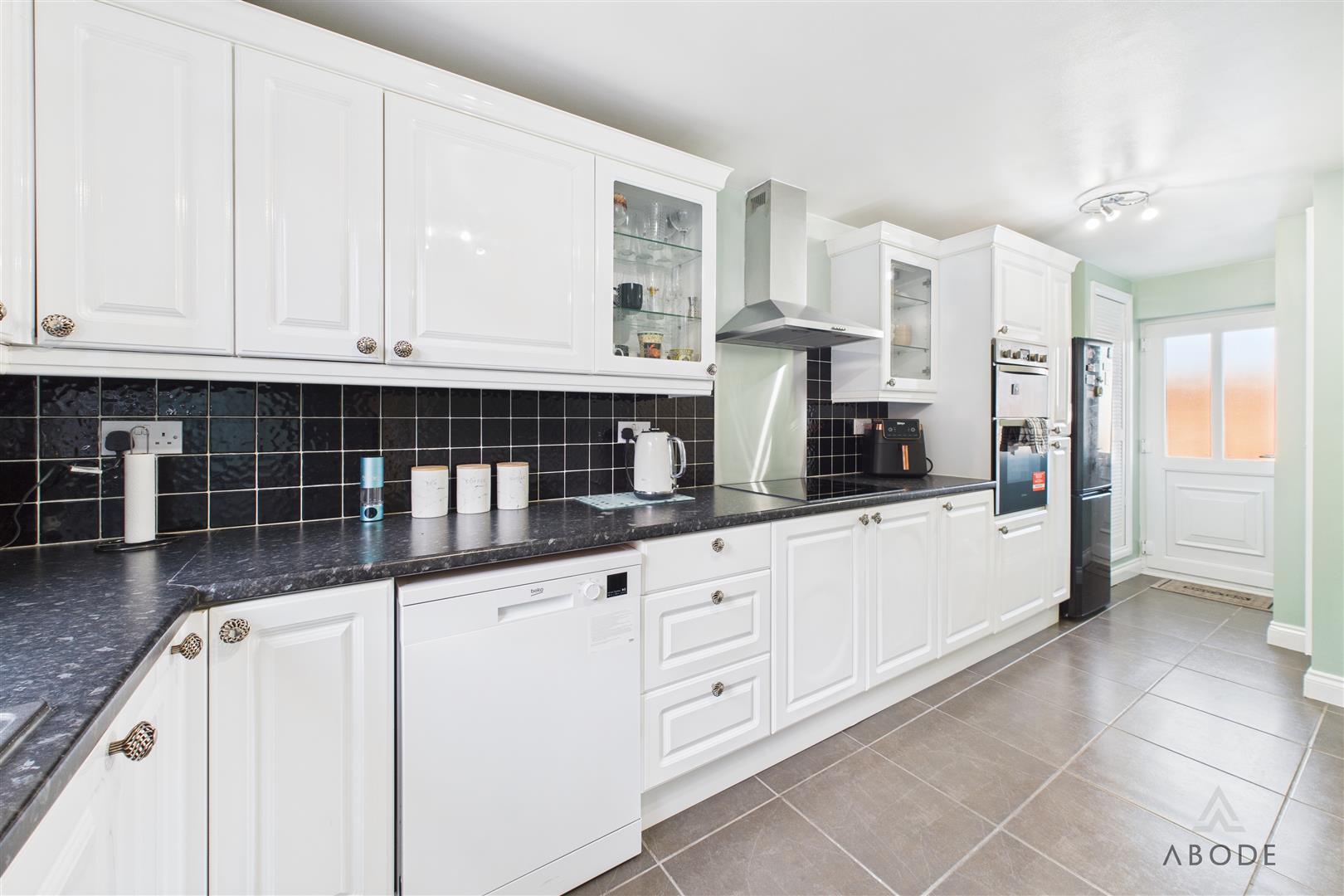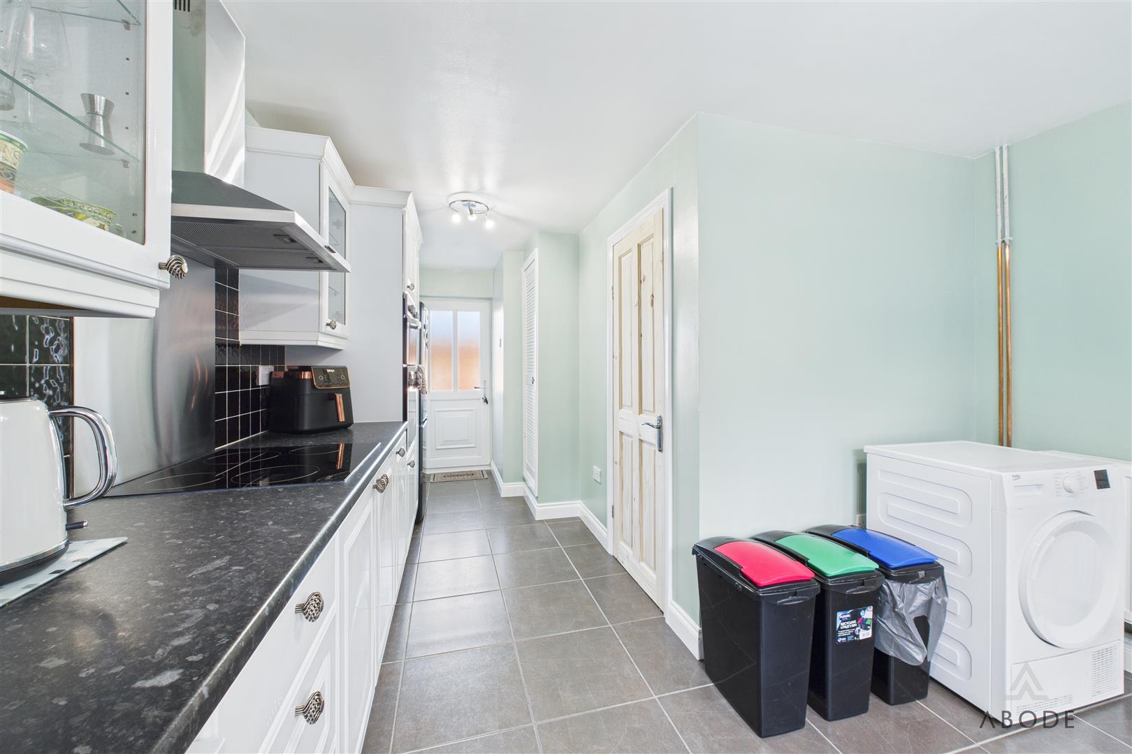 Positioned to the rear, the kitchen is a generous and practical room fitted with a range of wall and base units, complemented by tiled splash backs and work surfaces. There is space for a variety of appliances, an integrated oven, inset hob with extractor over, and a sink positioned beneath a window overlooking the rear garden. A rear door provides direct access outside, making this a convenient space for everyday living.