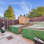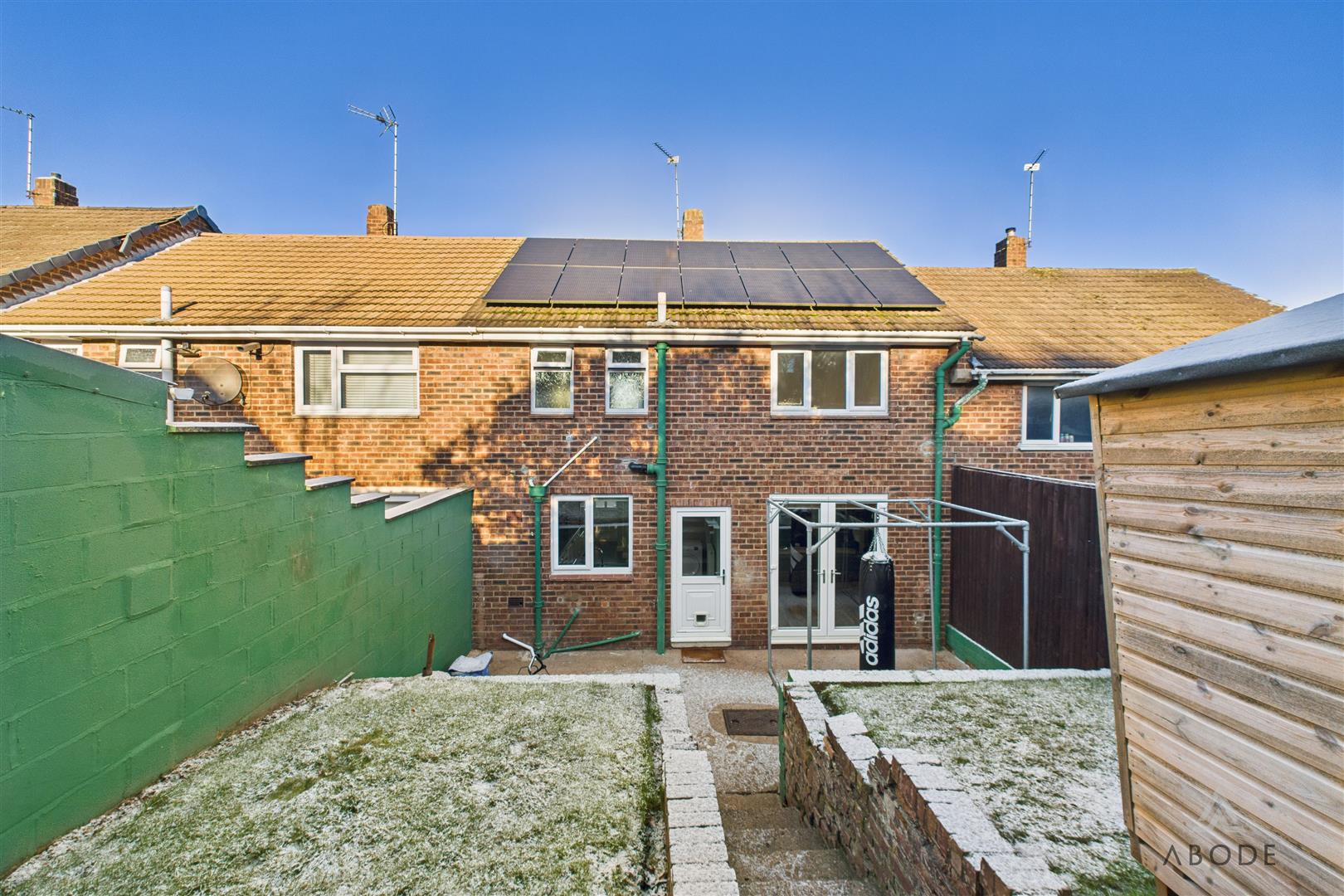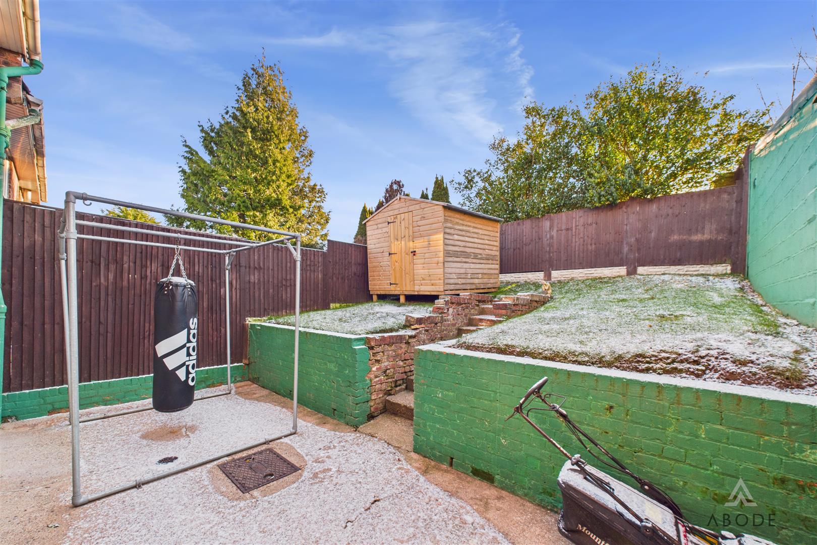 To the front, steps lead up to the entrance with a lawned fore garden. To the rear, the garden is arranged over multiple levels, featuring a paved seating area directly from the property, steps rising to lawned sections, and enclosed boundaries providing privacy. A timber shed offers useful outdoor storage. Solar panels are installed on the roof.