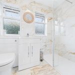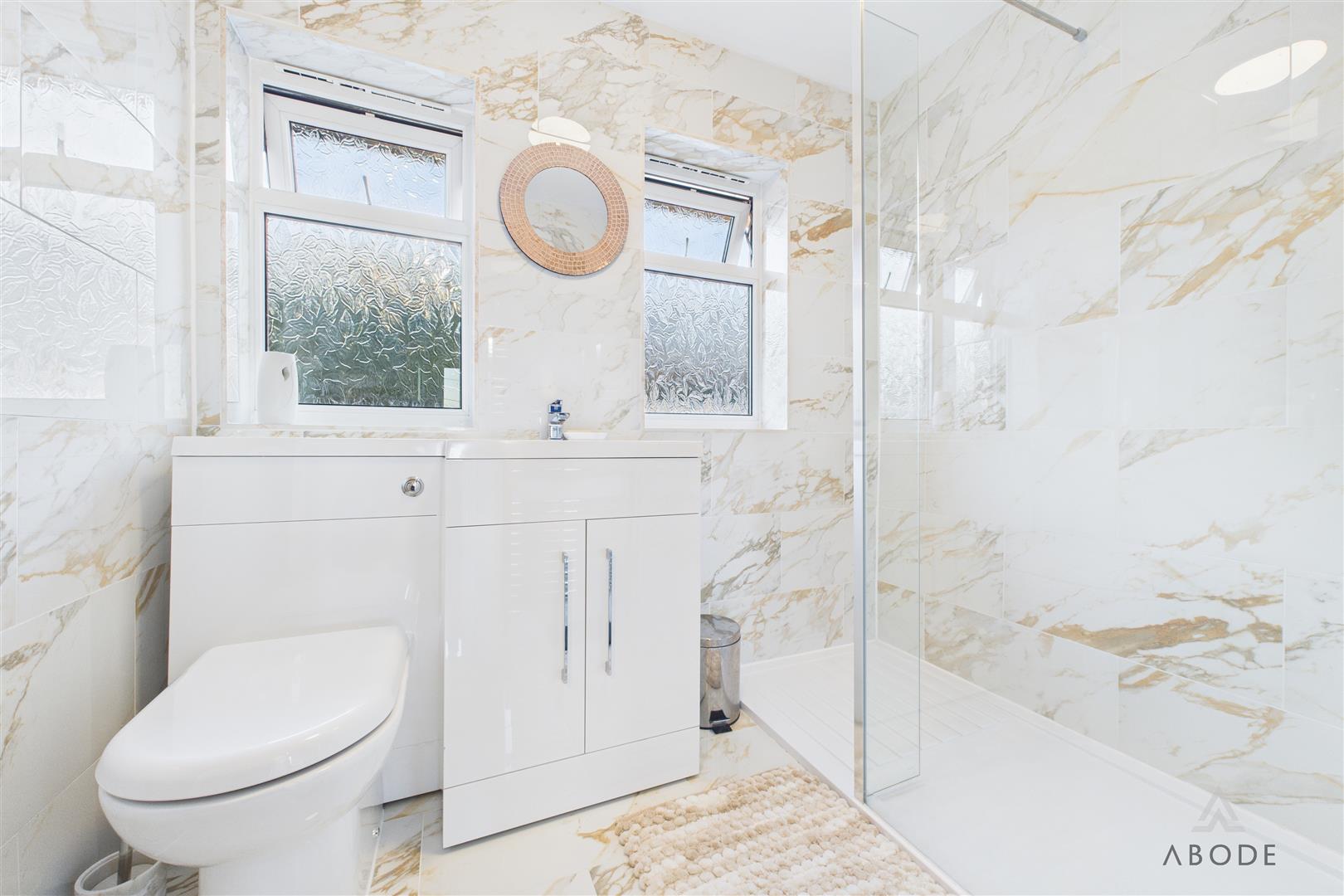 The shower room is finished to a contemporary standard and features a walk-in style shower enclosure, wash hand basin with vanity storage, low-level WC and a heated towel rail, with full wall tiling completing the space.