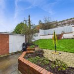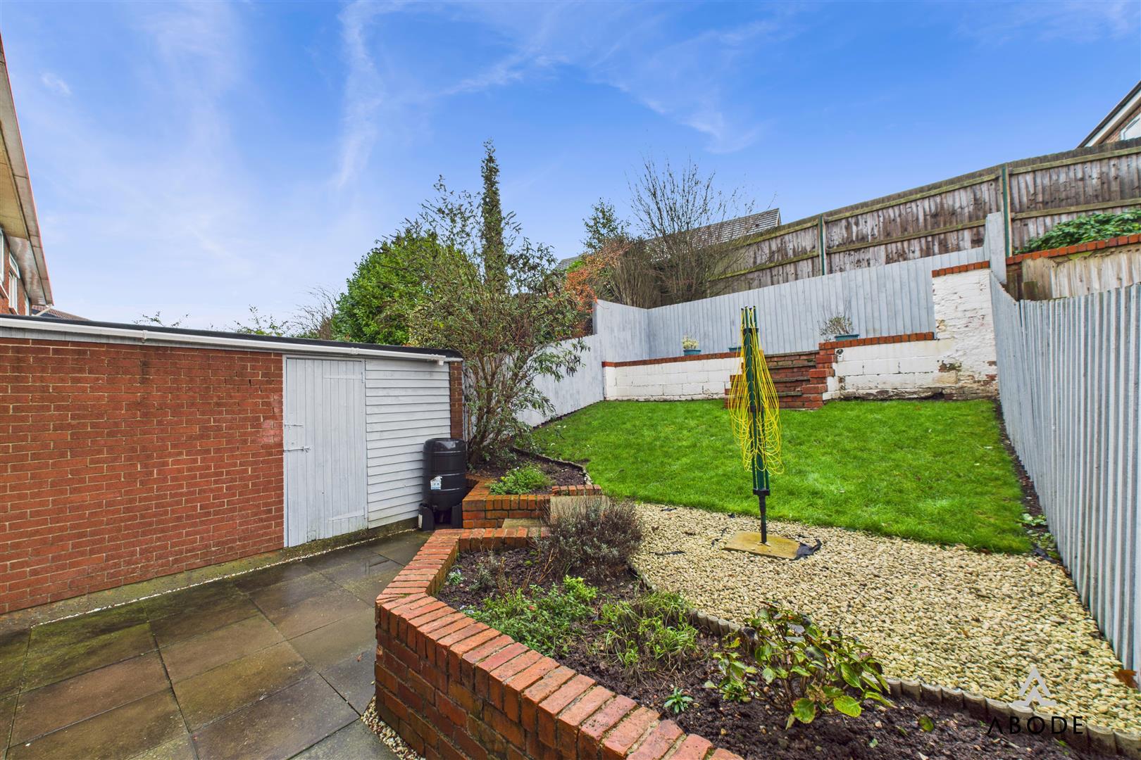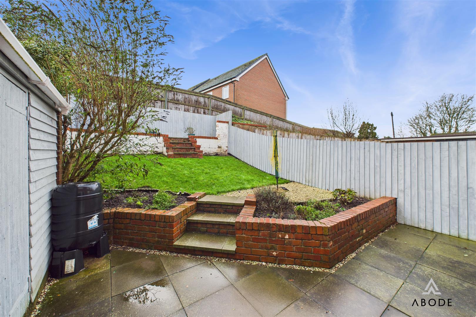 The rear garden is a standout feature of the home—thoughtfully landscaped to create a practical and attractive outdoor space. A large paved patio provides an ideal area for outdoor dining, with steps leading up to a lawned section and raised beds. Fencing encloses the garden, offering good privacy, and a useful brick-built outbuilding provides additional storage.