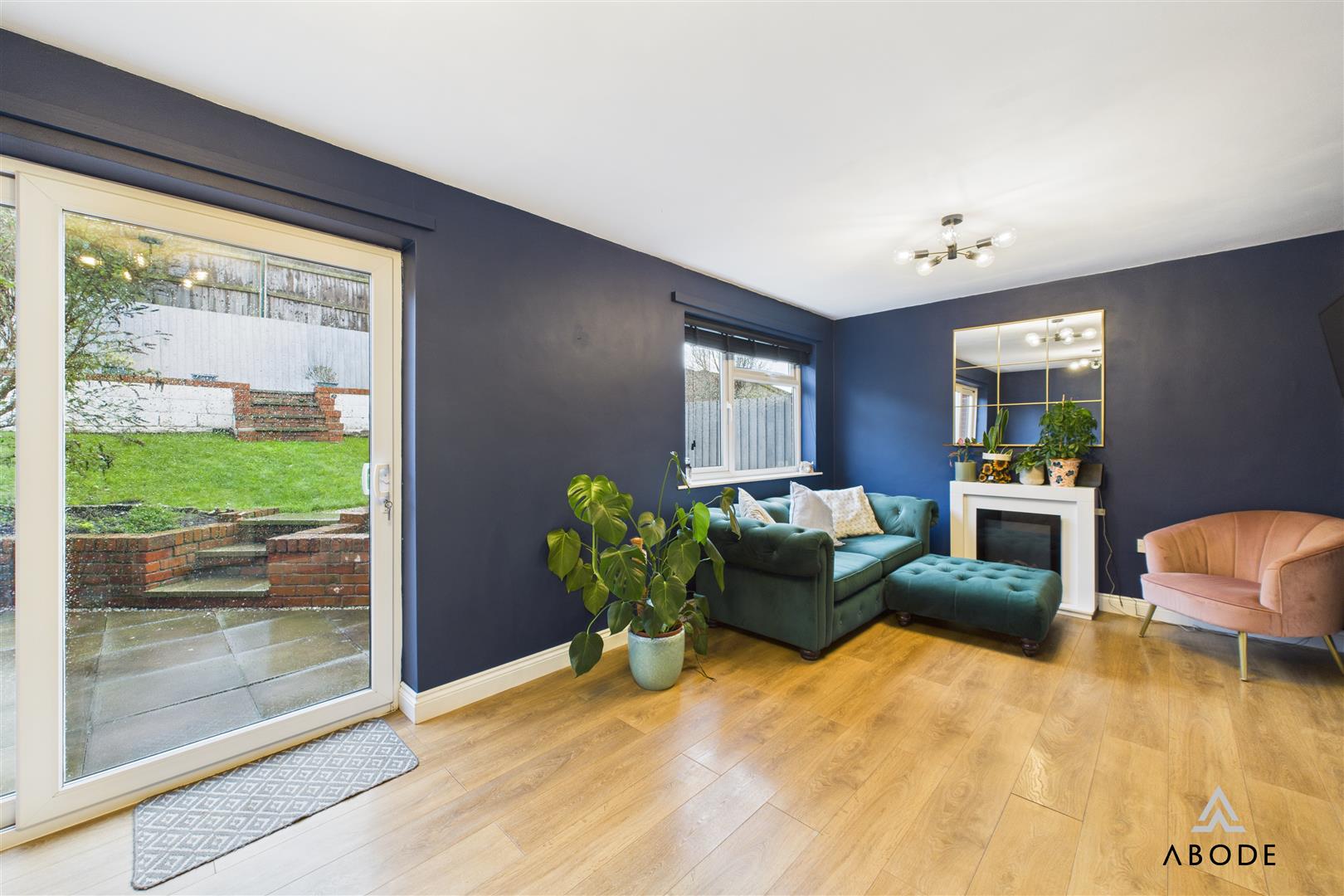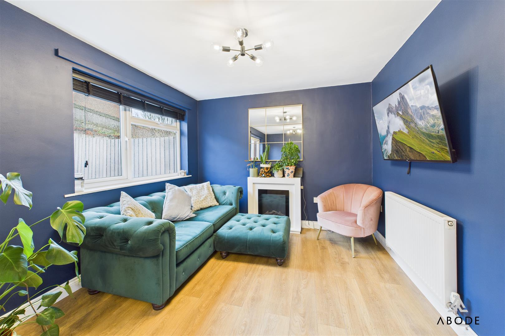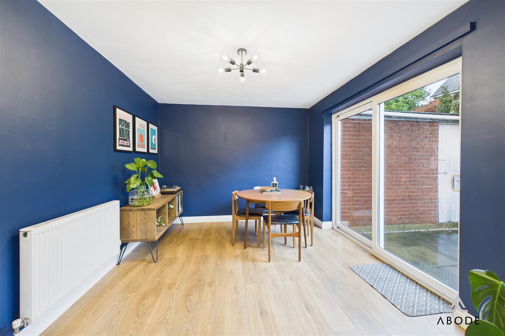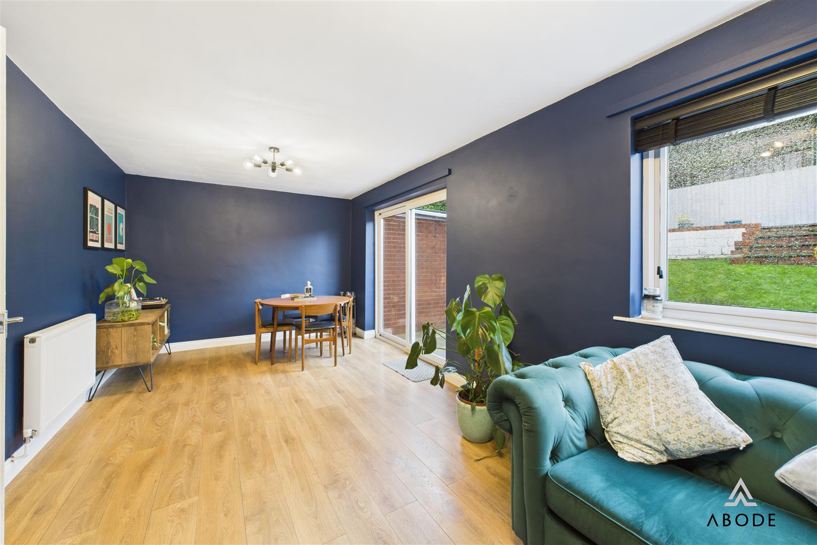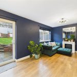 To the rear, the impressive lounge diner extends across the full width of the property. This spacious room offers defined areas for both seating and dining, with contemporary décor, wood-effect flooring, and sliding doors opening directly out to the rear garden. A further window to the rear elevation enhances the brightness, creating a comfortable and social everyday living space.