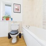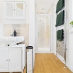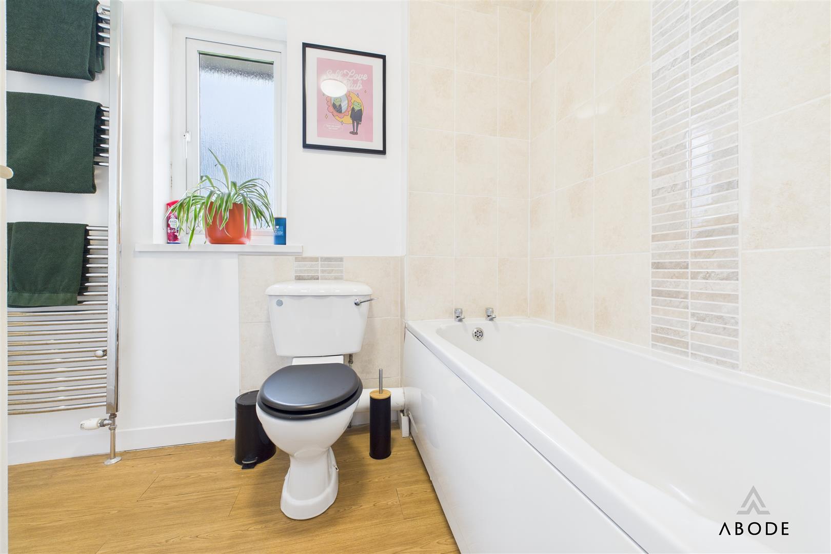 The bathroom is fitted with a corner bath, separate shower cubicle, wash basin with storage, and WC, all complemented by tiled walls and a heated towel rail.