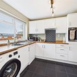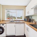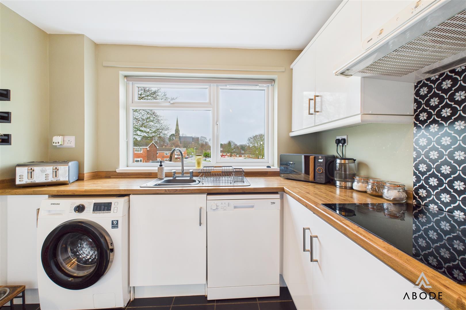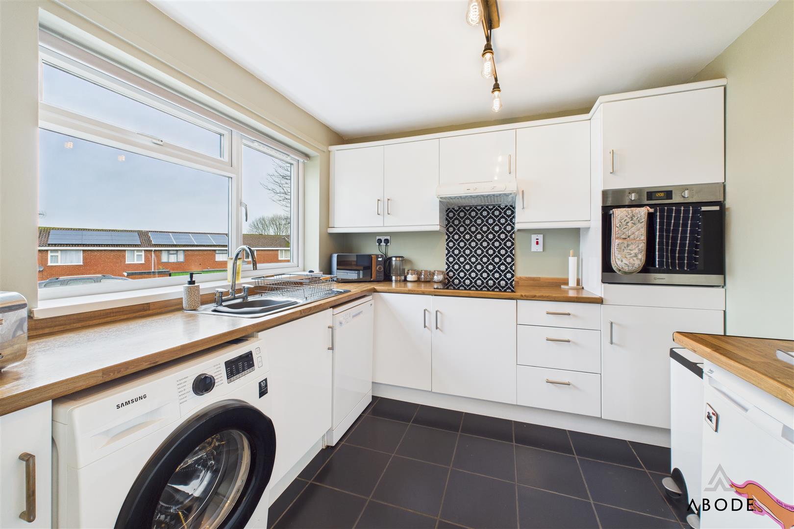 The kitchen is positioned to the front of the home and features crisp white units with wood-effect worktops, a built-in oven, hob with patterned splashback, space and plumbing for further appliances, and a large picture window drawing in natural light.