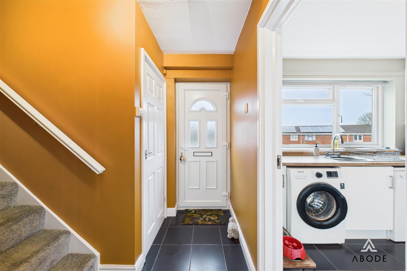 The property opens into a bright and welcoming entrance hallway with practical tiled flooring, stairs rising to the first floor, and doors leading to the kitchen and lounge diner.