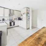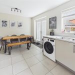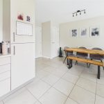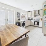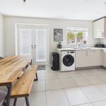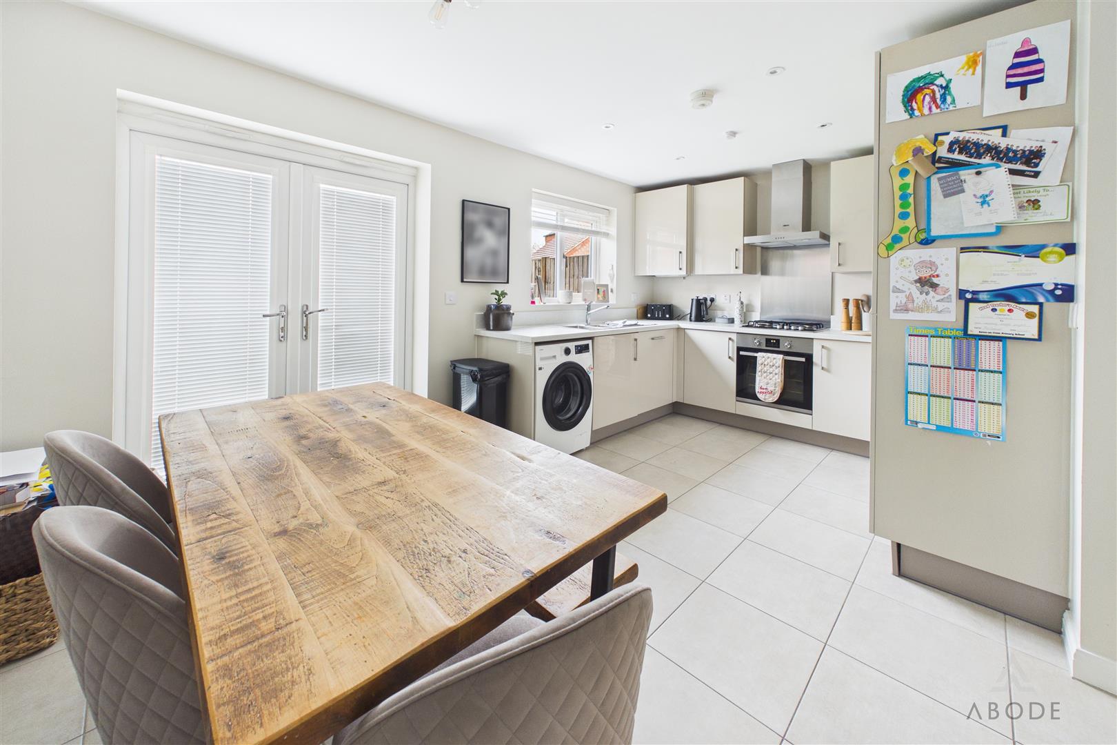 Fitted wall mounted base and drawer units with work surfaces and a sink and drainer unit. Electric oven with a gas hob and an extractor hood. Integrated dishwasher and fridge freezer, plumbing and space for a washing machine. Upvc double glaze window and double doors onto the garden, radiator, tiled floor and an under stairs storage cupboard.