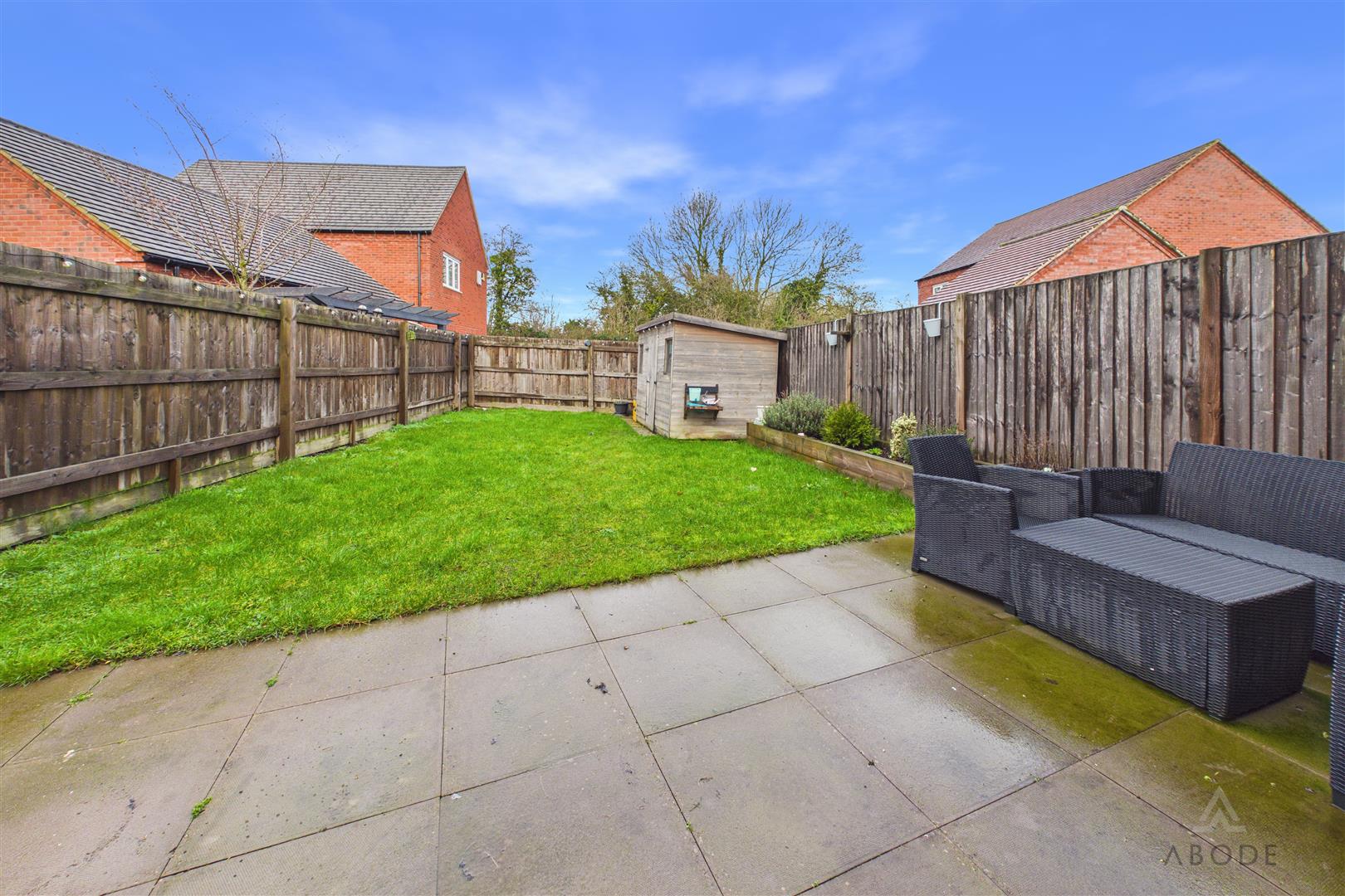 Enclosed rear garden with a lawn and paved patio. Garden shed with power and a side driveway.