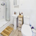 Shower, low flush wc, wash hand basin and a radiator.