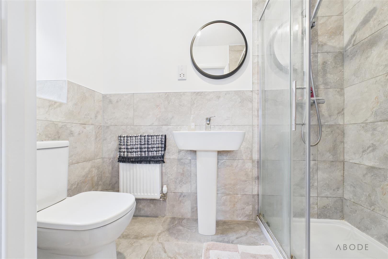 Modern suite comprising;- WC, wash hand basin and double shower cubicle. Tiled flooring and partially tiled walls, central heating radiator, UPVC double glazed window to the side elevation.