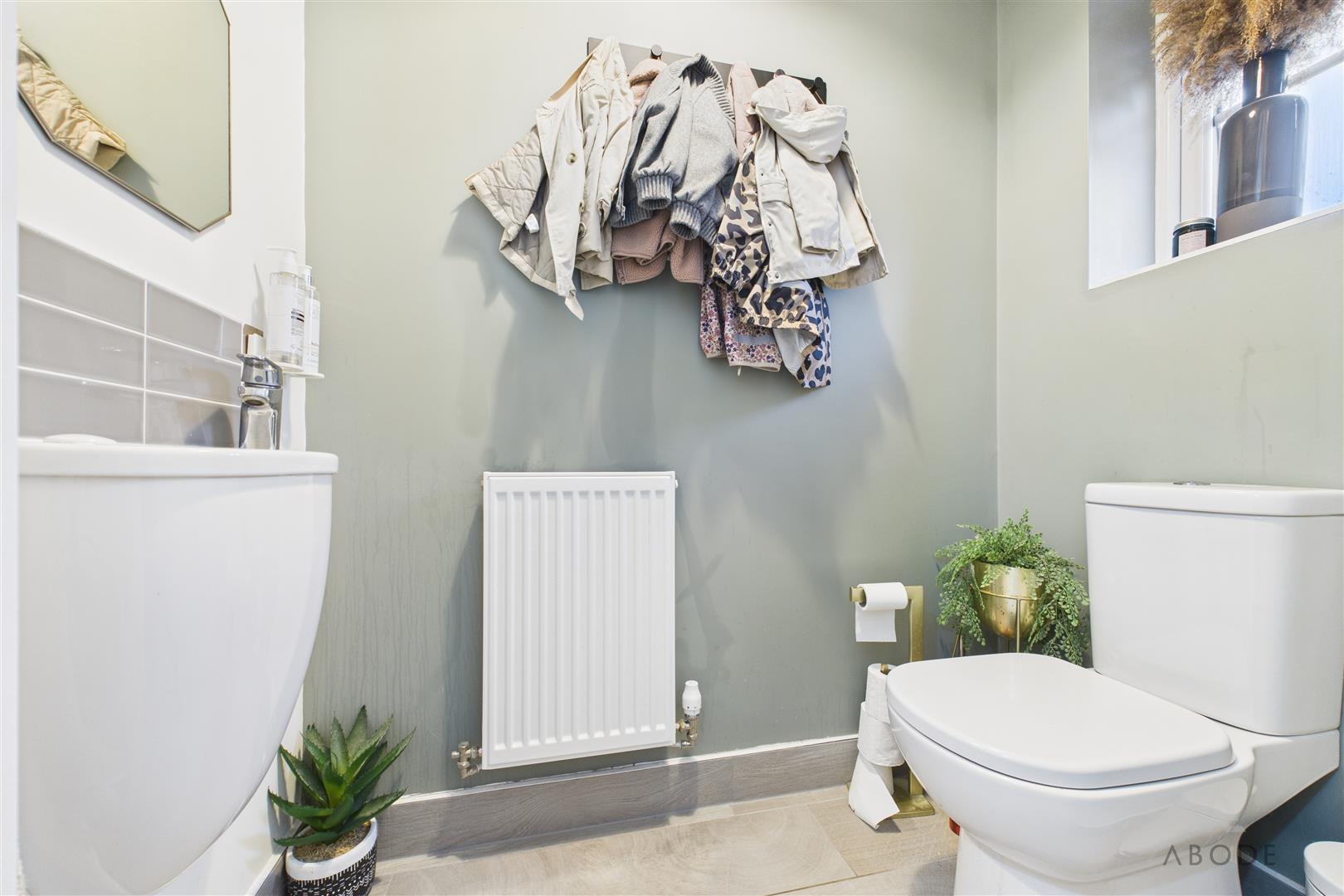 WC, wash hand basin with tiled splashback, tiled flooring, central heating radiator and UPVC double glazed window to the front elevation.
