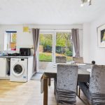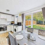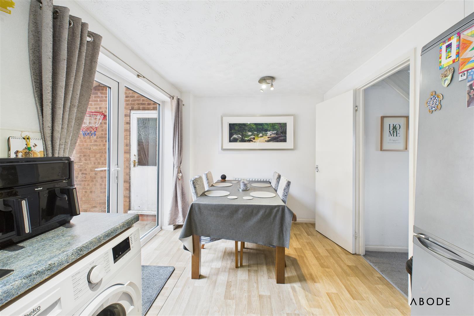 Positioned at the rear of the home, the kitchen diner includes matching wall and base units with roll-edge preparation work surfaces, a stainless steel sink with mixer tap and drainer, integrated oven with four-ring gas hob and extractor, tiled splashbacks, and space for further appliances. There is ample room for a dining table, a double glazed window overlooking the rear garden, and French doors leading directly to the patio area.