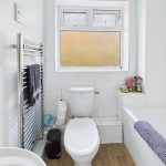 The family bathroom comprises a three-piece suite including a bath with shower over and glass screen, wash-hand basin, and low-level WC, complemented by tiled walls, a heated towel rail, and a double glazed window with opaque glass to the rear.