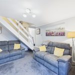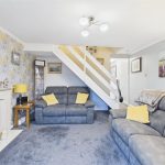 To the rear of the property is the main living room, offering a comfortable reception space with French doors opening directly onto the rear garden. The natural light and garden access enhance the sense of space, while stairs rise from this room to the first floor.