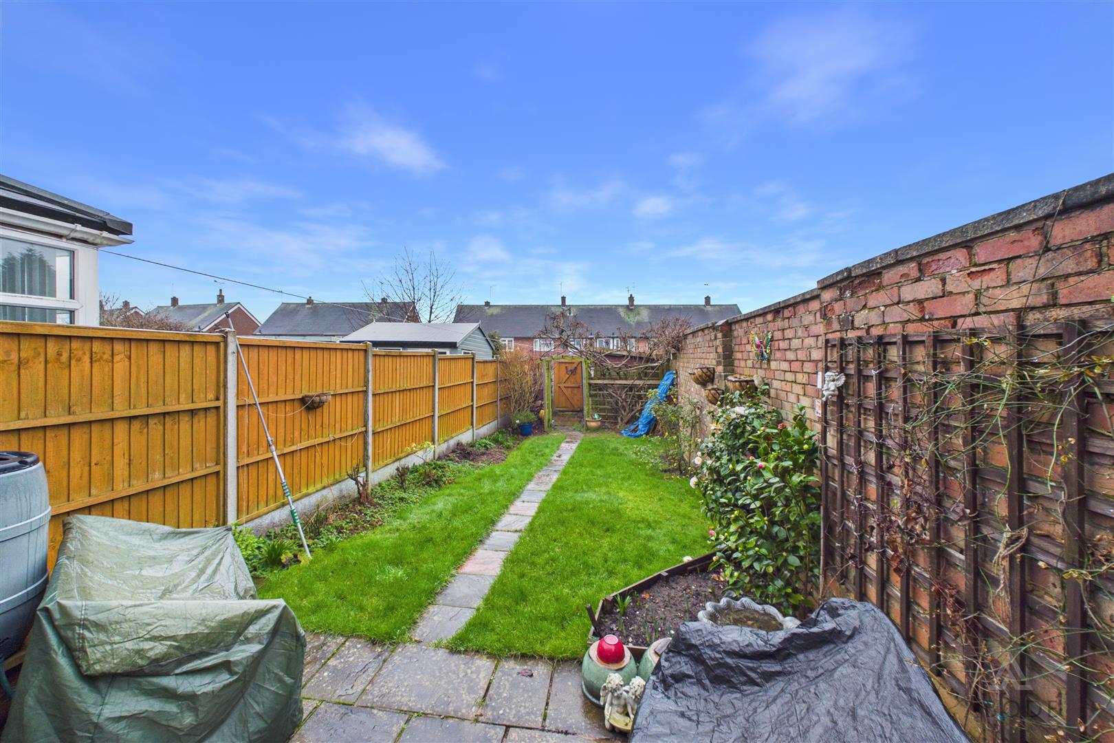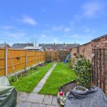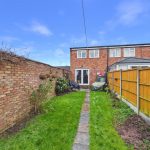 The rear garden is enclosed and mainly laid to lawn, with a paved patio area directly off the French doors — ideal for outdoor seating and entertaining. A central pathway leads through the lawn towards the rear boundary, with fencing and brick wall boundaries providing privacy.