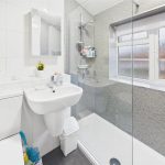 The shower room is fitted with a walk in shower, wash hand basin and low-level WC, finished in a neutral style.