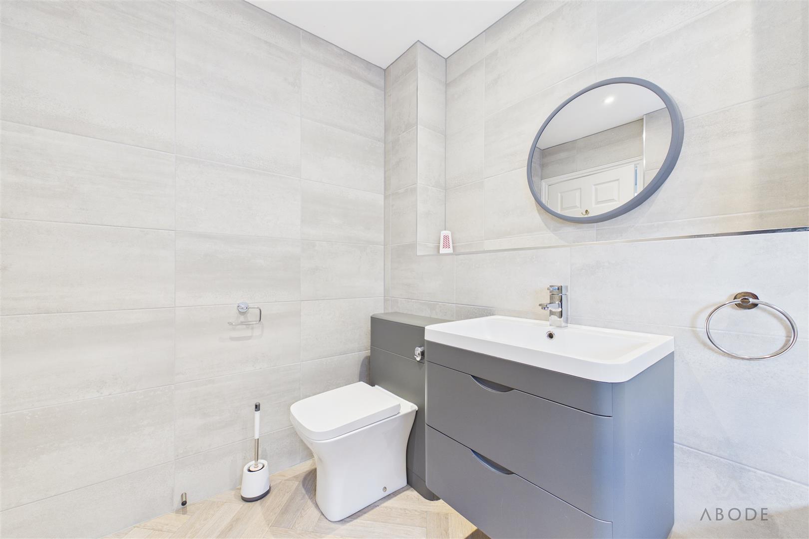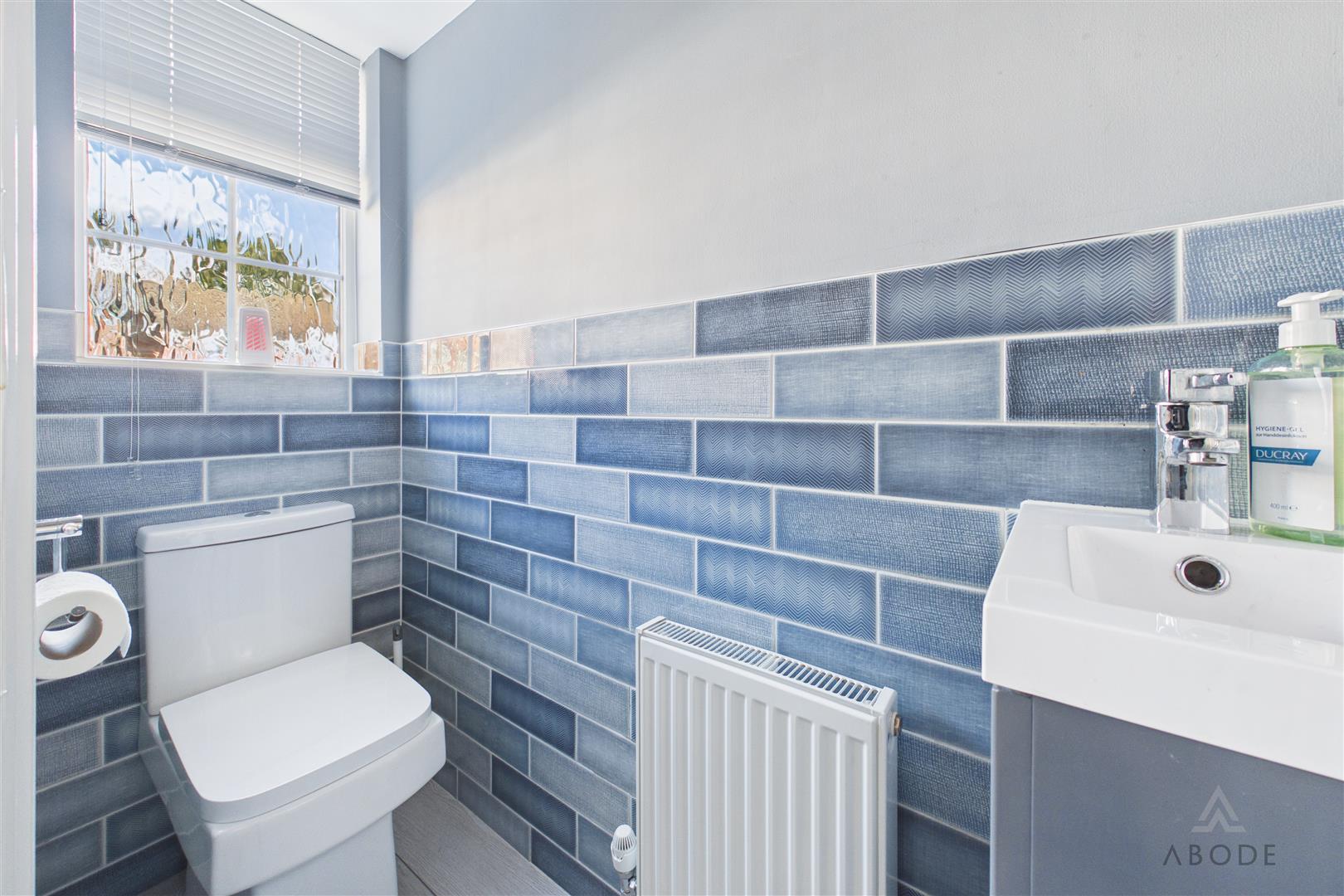 Fitted with a UPVC double-glazed frosted window to the front elevation, this stylish cloakroom comprises a low-level WC with continental flush, wash hand basin with mixer tap, complementary wall and floor tiling, ceiling spotlights, and a central heating radiator.