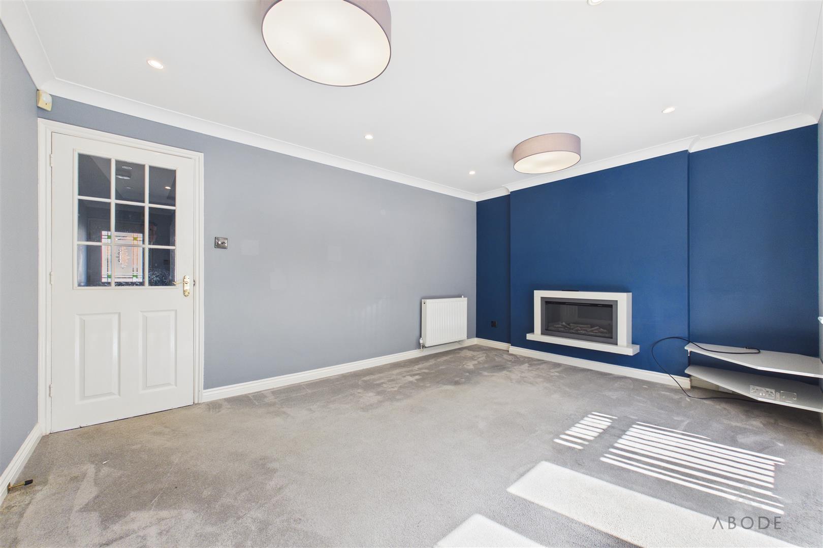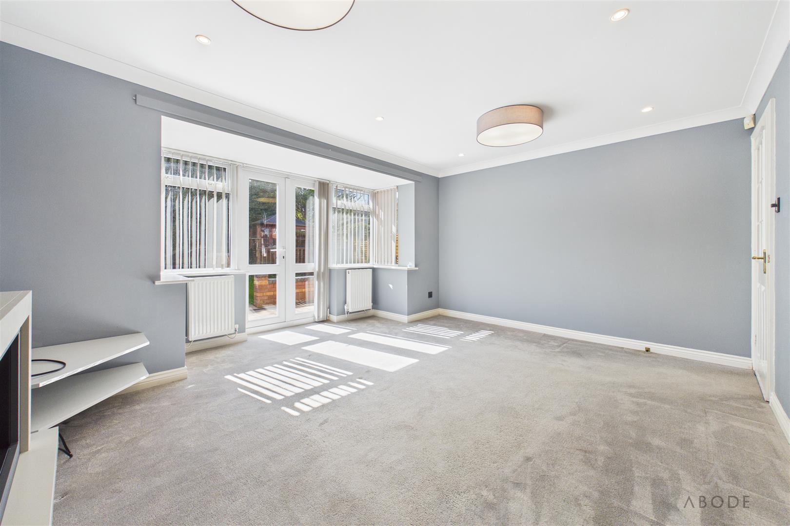 A spacious and well-presented living area featuring a UPVC double-glazed box bay window to the rear elevation and French doors opening onto the rear garden. The room is centred around a contemporary wall-mounted electric fireplace and benefits from three central heating radiators, ceiling spotlights, and a TV aerial point.