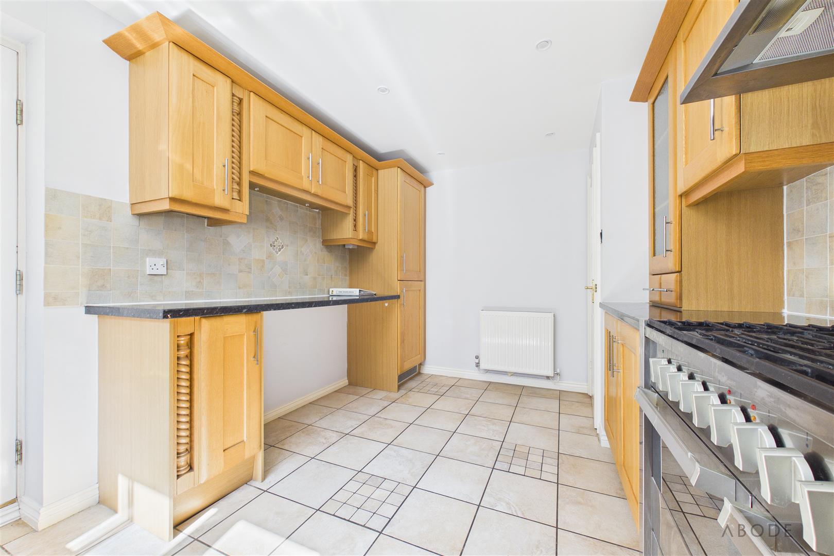 Fitted with a range of matching base and eye-level units with work surfaces over, the kitchen includes a UPVC double-glazed window overlooking the rear garden and a hardwood frosted glazed side access door. Integrated appliances include a five-ring range-style cooker with oven and grill, extractor hood, fridge, freezer, and dishwasher. There is also a one-and-a-half bowl stainless steel sink with mixer tap, ceiling spotlights, and space and plumbing for additional undercounter appliances.