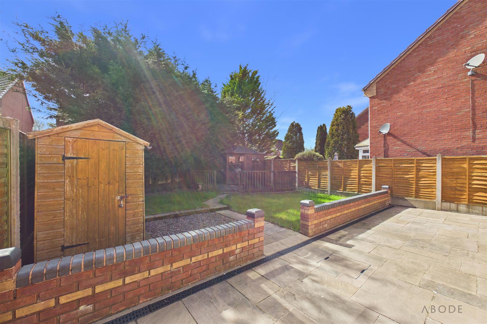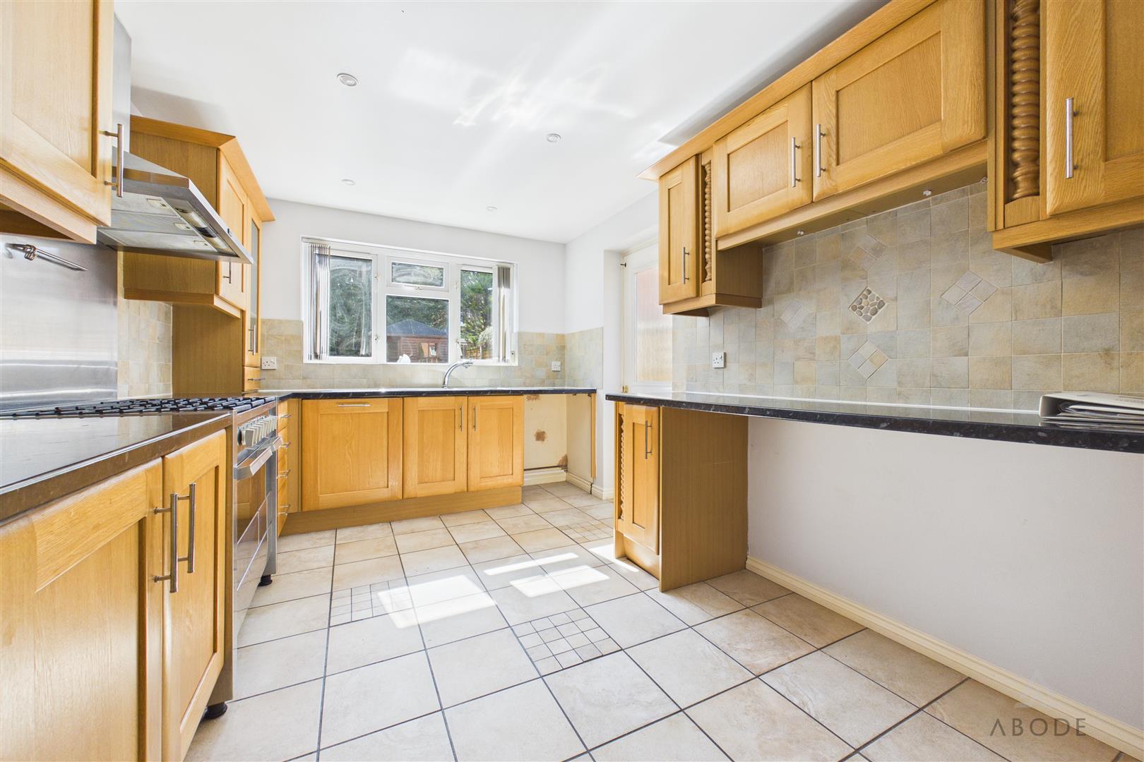 Fitted with a range of matching base and eye-level units with work surfaces over, the kitchen includes a UPVC double-glazed window overlooking the rear garden and a hardwood frosted glazed side access door. Integrated appliances include a five-ring range-style cooker with oven and grill, extractor hood, fridge, freezer, and dishwasher. There is also a one-and-a-half bowl stainless steel sink with mixer tap, ceiling spotlights, and space and plumbing for additional undercounter appliances.