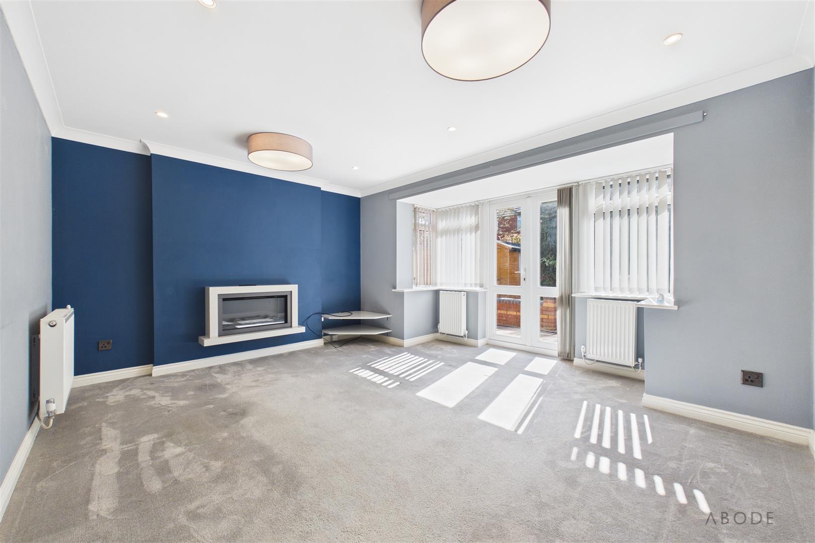 A spacious and well-presented living area featuring a UPVC double-glazed box bay window to the rear elevation and French doors opening onto the rear garden. The room is centred around a contemporary wall-mounted electric fireplace and benefits from three central heating radiators, ceiling spotlights, and a TV aerial point.