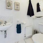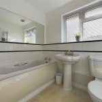 With a UPVC double-glazed frosted window to the rear elevation, featuring a three-piece bathroom suite comprising a low-level WC, pedestal wash hand basin, and a bath unit with complementary tiling surround. Additional features include a central heating radiator, chrome heated towel radiator, extractor fan, and ceiling spotlighting.