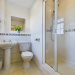 Featuring a three-piece shower room suite, comprising a low-level WC, pedestal wash hand basin, and a double shower cubicle with a shower over. Additional features include complementary tiling to the wall coverings, a chrome heated towel radiator, a central heating radiator, an extractor fan, a shaving point, and ceiling spotlighting.