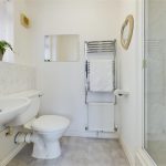 With a UPVC double-glazed frosted window to the side elevation, featuring a three-piece shower room suite comprising a low-level WC, pedestal wash hand basin, and a shower cubicle with complementary tiling to the wall coverings. Additional features include a chrome heated towel radiator, central heating radiator, and extractor fan.
