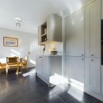 A range of built-in appliances includes a four-ring gas hob with a built-in extractor, oven, and grill, a fridge, freezer, dishwasher, and a 1½ stainless steel sink and drainer with a mixer tap. Additional features include LED downlighting, a wine rack, and a central heating radiator.